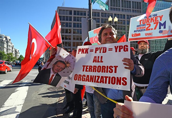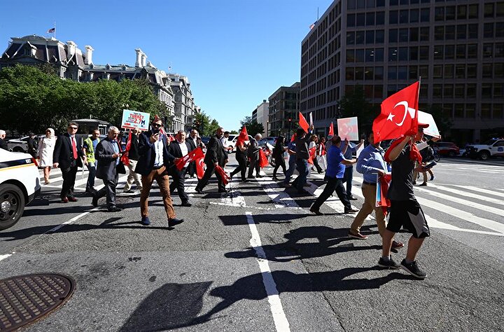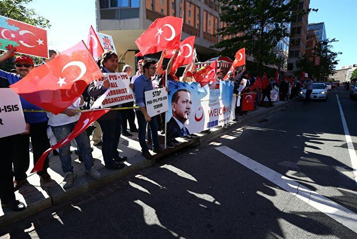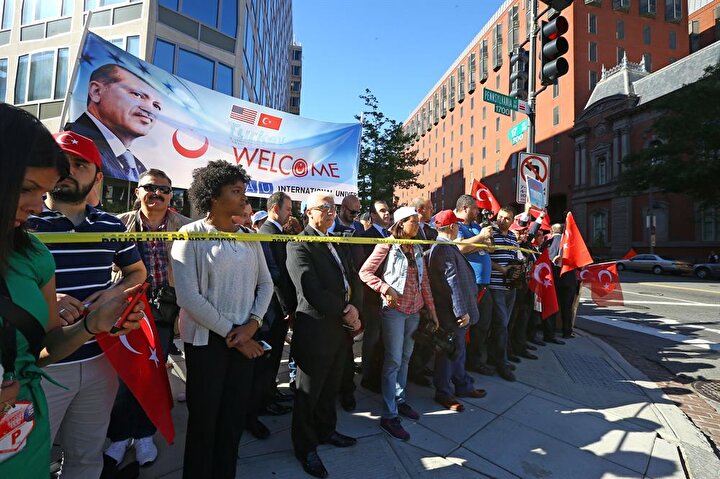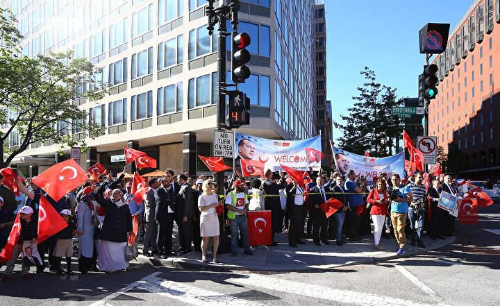 Cumhurbaşkanı Recep Tayyip Erdoğan, ABD'de Blair House'a gelişinde kendisini caddede bekleyen kentteki Türkler ve diğer vatandaşlar tarafından karşılandı. "Türkiye'yi seviyoruz", "PKK-YPG/PYD-DEAŞ terörünü durdurun", "2,7 milyon Suriyeli'ye ev sahipliği yaptığınız için teşekkür ederiz", "İslamofobiye karşı bir araya geldik" yazılı pankartlar ve Erdoğan posterleri taşıyan grup, Türk bayraklarıyla Cumhurbaşkanı Erdoğan'a sevgi gösterilerinde bulundu.