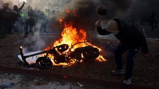 Başkent Paris'te Cumhuriyet Meydanı'ndan Nation Meydanı'na yürüyen göstericiler, bisiklet, scooter ve çöp bidonlarını ateşe verdi. Polis, göstericilere biber gazı ve copla müdahale etti.