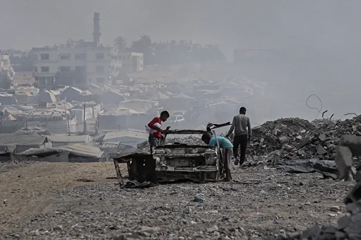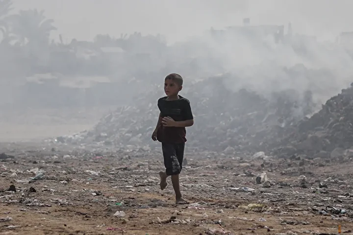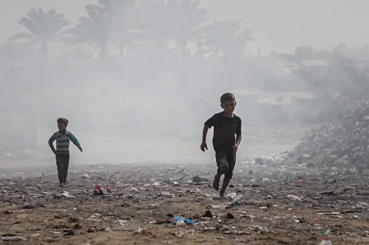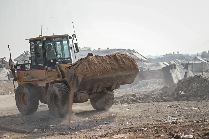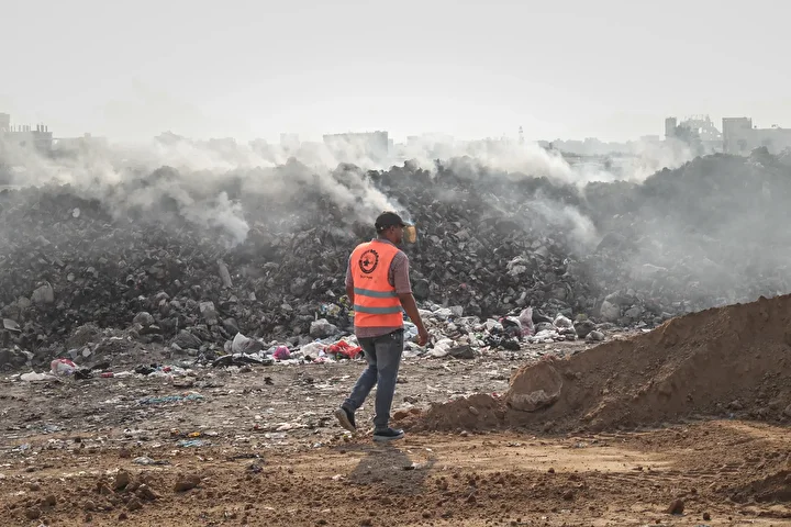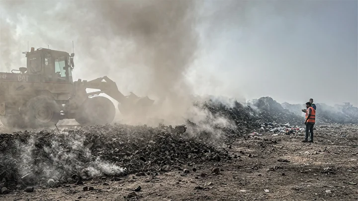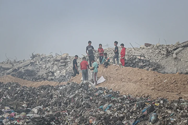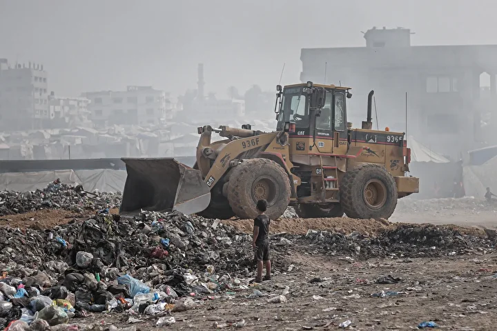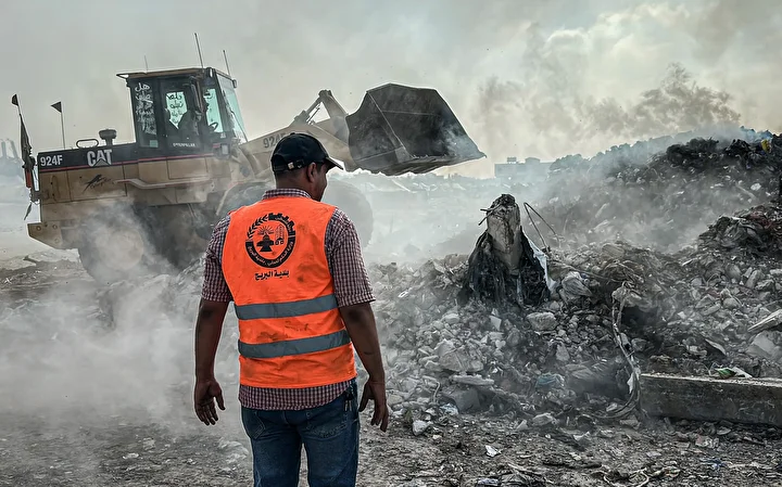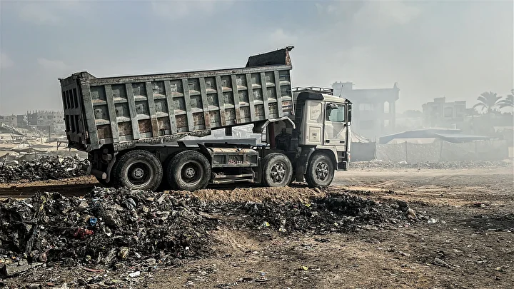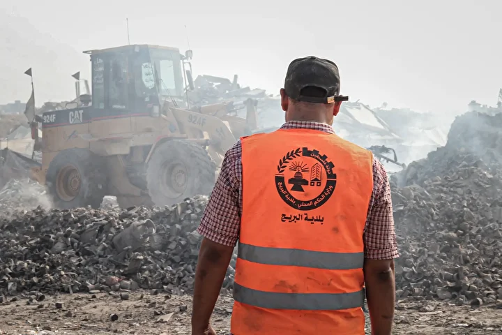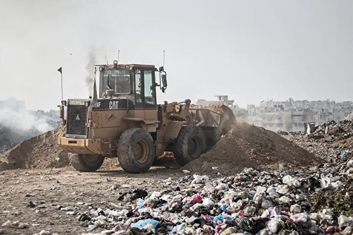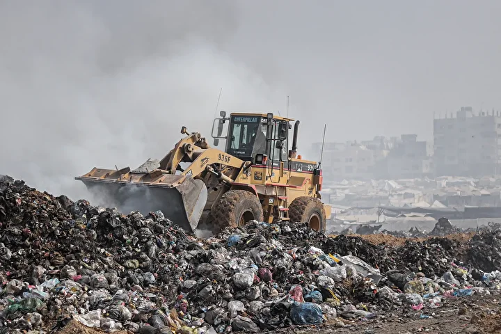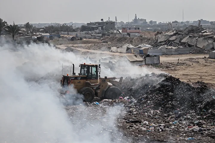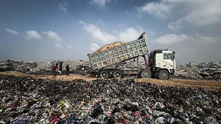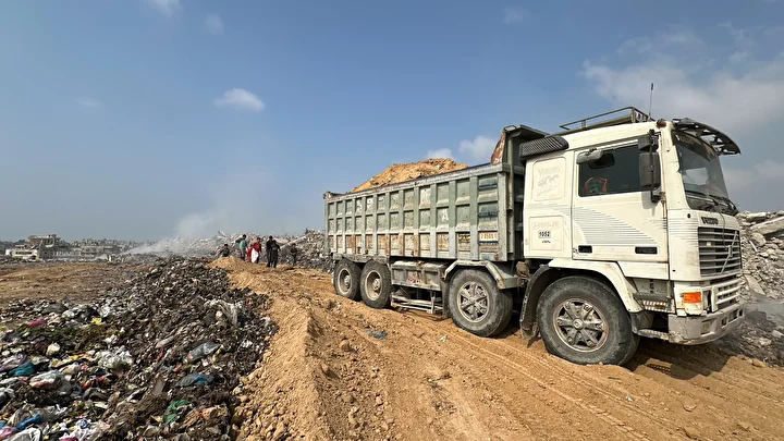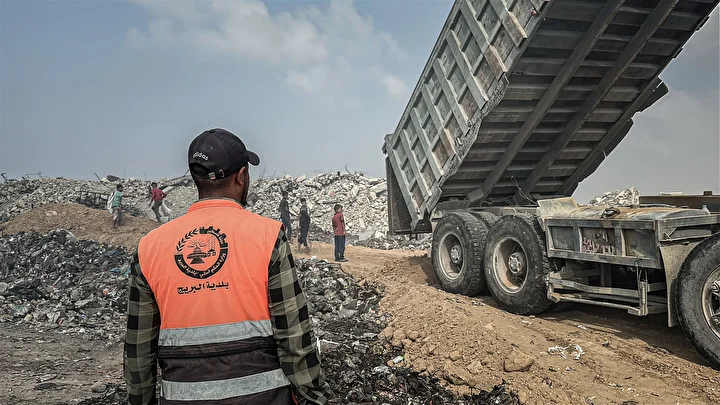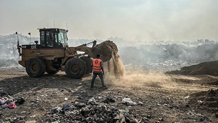 Gazze'deki Bureyc Belediyesi, yerinden edilmiş Filistinlilerin sığındıkları çadırların çevresinde biriken çöp yığınlarından yayılan zehirli duman ve kötü kokuları azaltmak için atıkları toprakla örtüyor. Belediye yetkilileri, sınırlı imkanlara rağmen bölge halkının sağlığını korumak ve çevredeki atık krizini önlemek amacıyla çalışmalarını sürdürüyor.