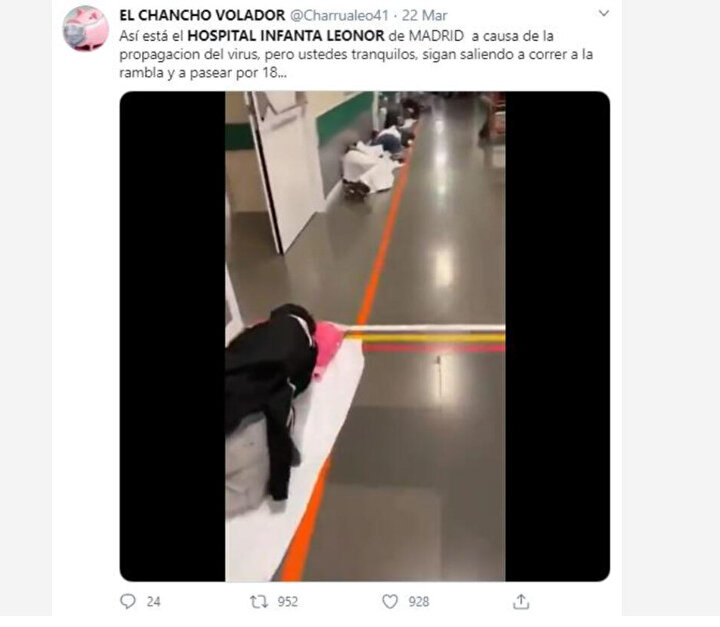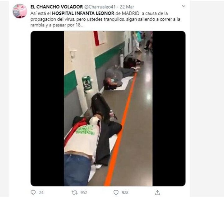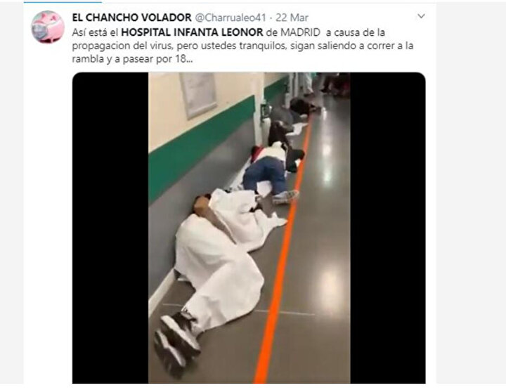 Ülkenin başkenti Madrid'in göbeğindeki Infanta Leonor Hastanesi'nde çekilen görüntüler sosyal medyada paylaşıldı. Tedavi olmak için sıra bekleyen hastaların yerlerde yatan görüntüsü infial yarattı.