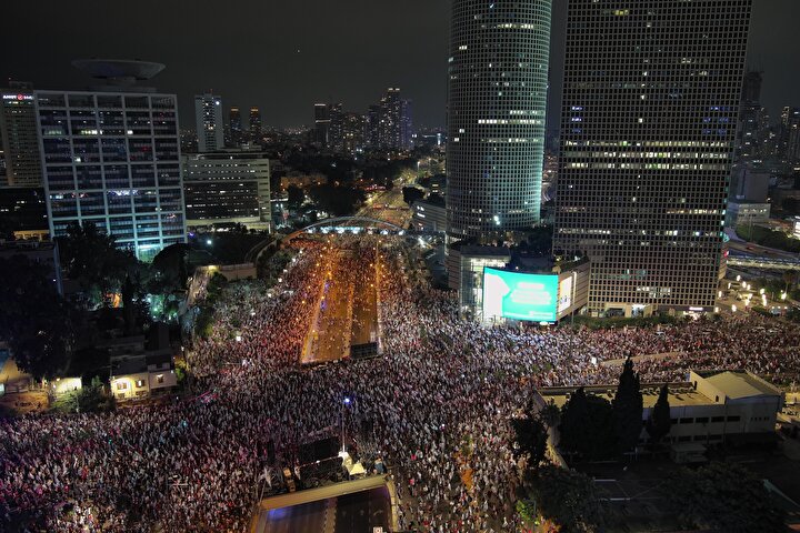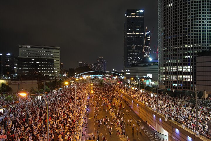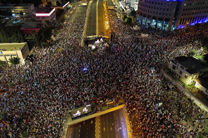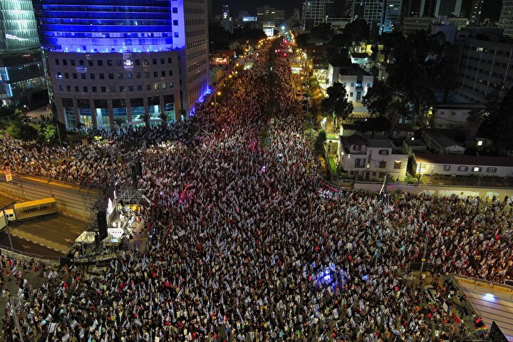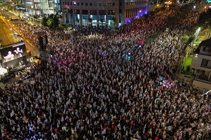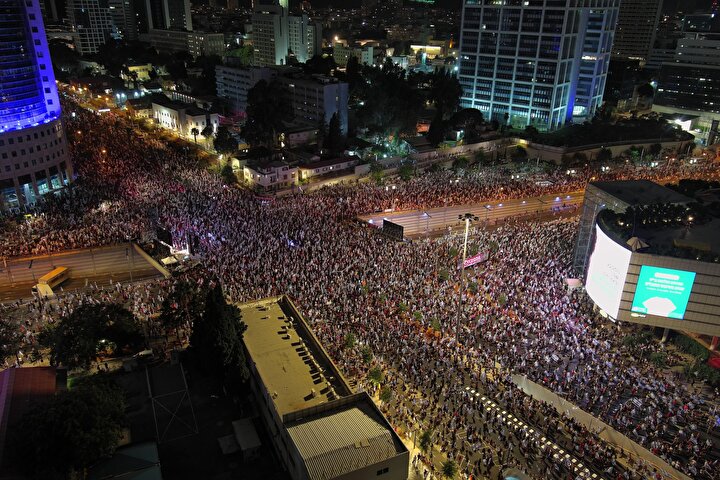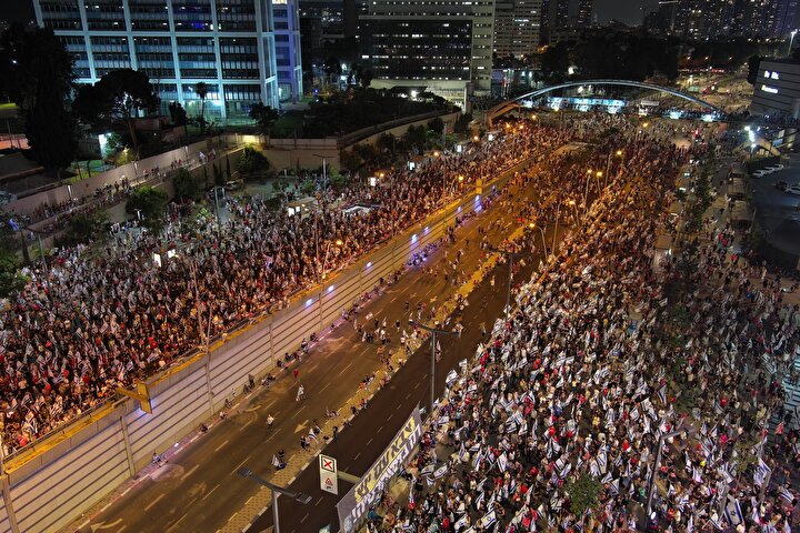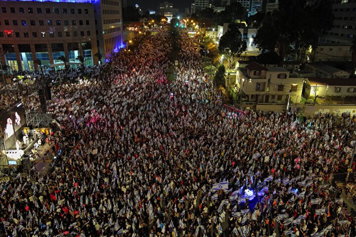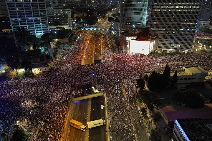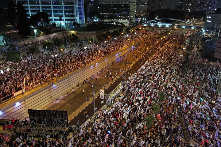 İsrail Başbakan Binyamin Netanyahu öncülüğündeki koalisyon hükümetinin yargı düzenlemesi kapsamında Yüksek Mahkemenin hükümet üzerindeki denetimini kaldıran yasa tasarısını Meclis'ten geçirmesini protesto eden İsrailliler ülke genelinde sokaklara indi. Her hafta olduğu gibi en yoğun katılımlı gösteriye ev sahipliği yapan Tel Aviv'de protestocular, Kaplan Caddesi'nde toplandı.