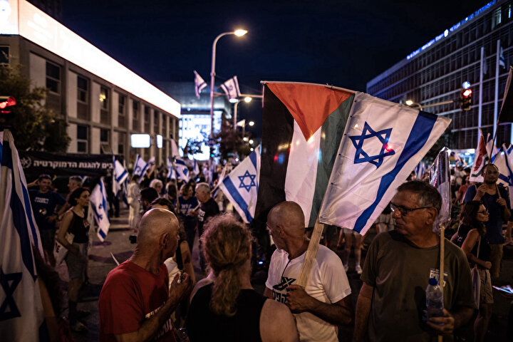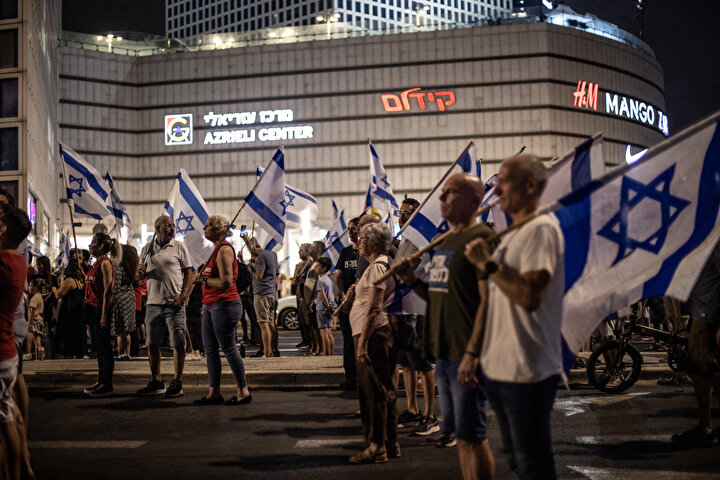 Tel Aviv’de, düzenlemeye karşı çıkan göstericiler, ellerinde İsrail bayraklarıyla kentin ana meydan ve caddelerinde toplandı.