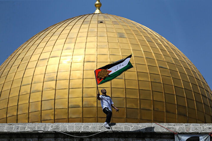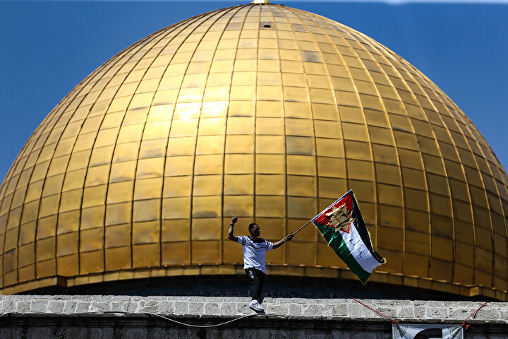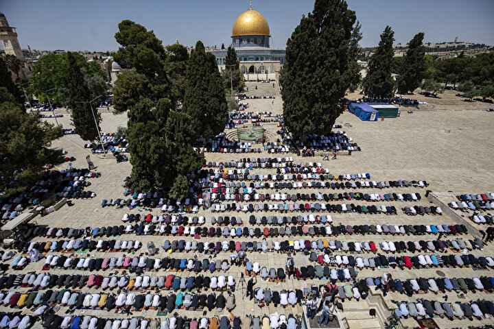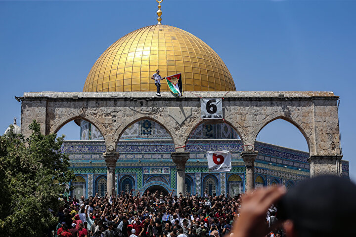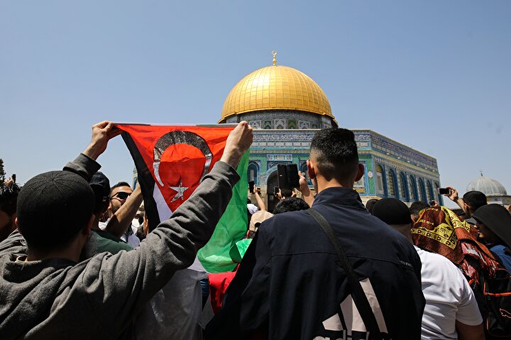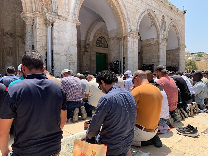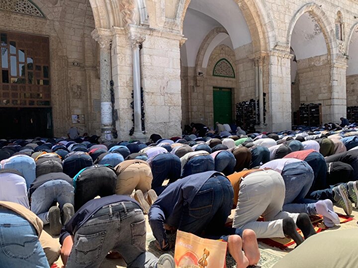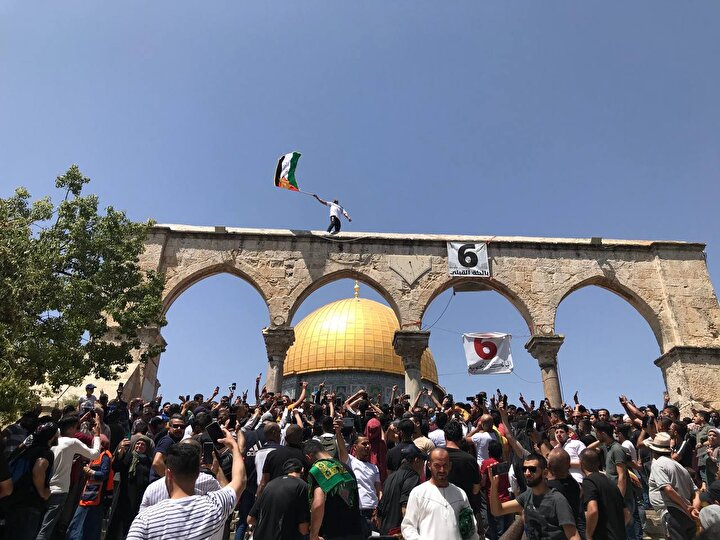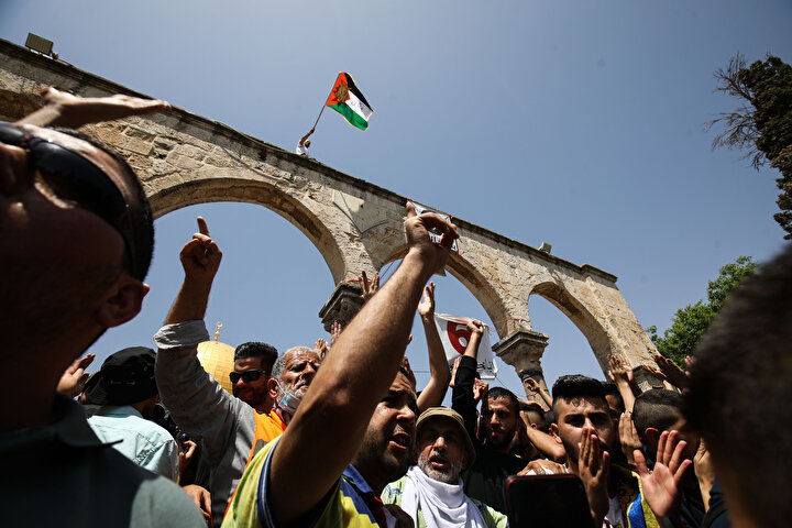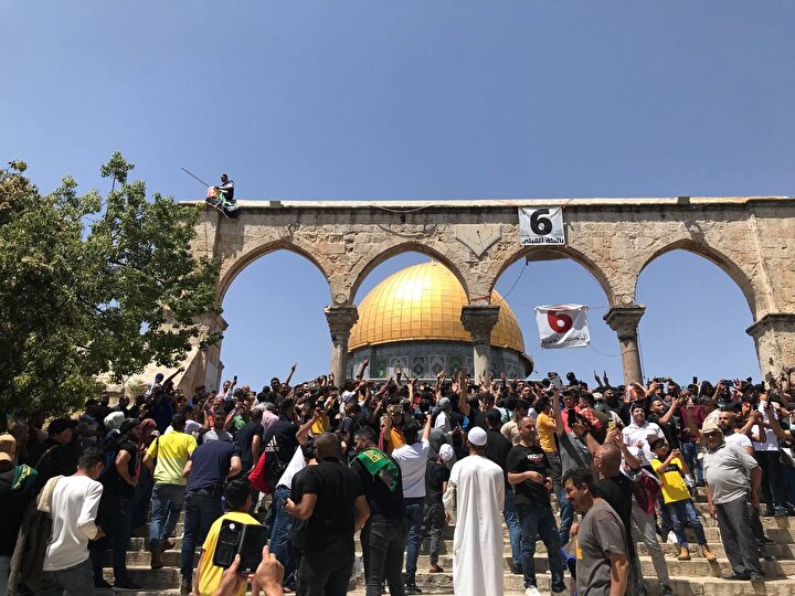 Bu arada bir grup Filistinli, Harem-i Şerif’te kılınan cuma namazı sonrası Kubbet’us Sahra ile Kıble Mescidi arasında kalan alanda tekbir ve sloganlar attı.