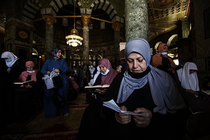 Batı Şeria'da yaşadıkları için İsrail'in olağan günlerde Kudüs'e geçişlerine izin vermediği Filistinliler, Mescid-i Aksa’daki Kubbetu's Sahra önünde hatıra fotoğrafları çektirdi.