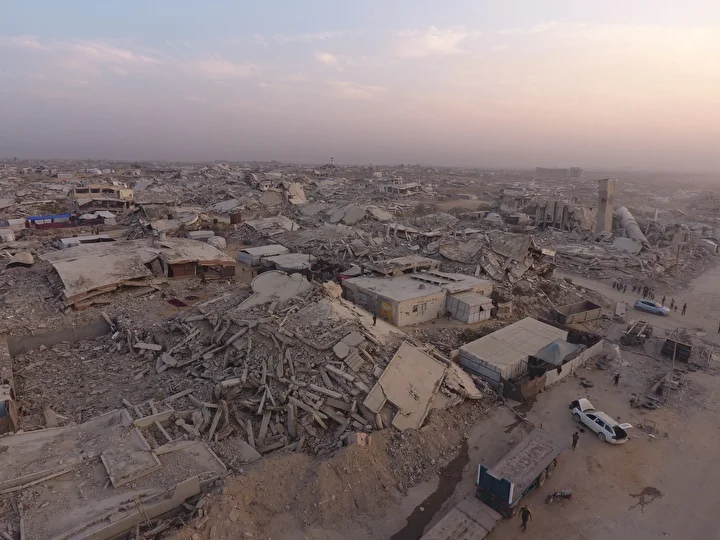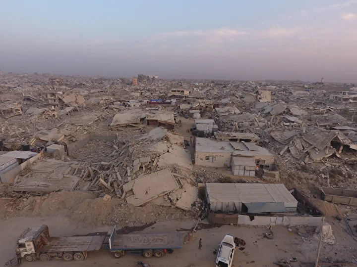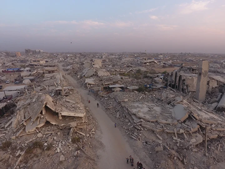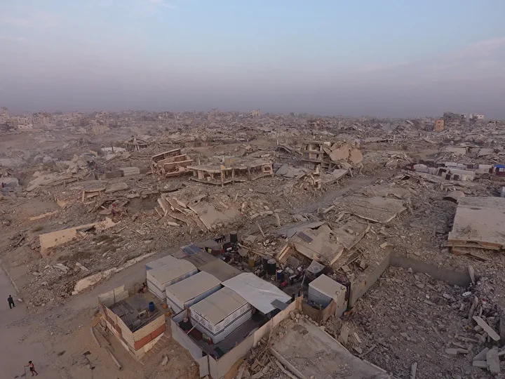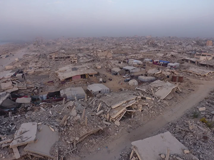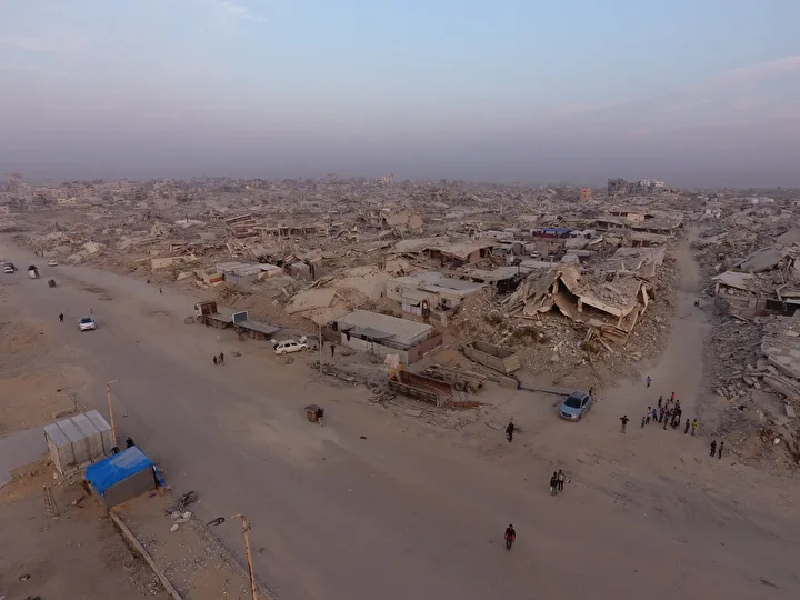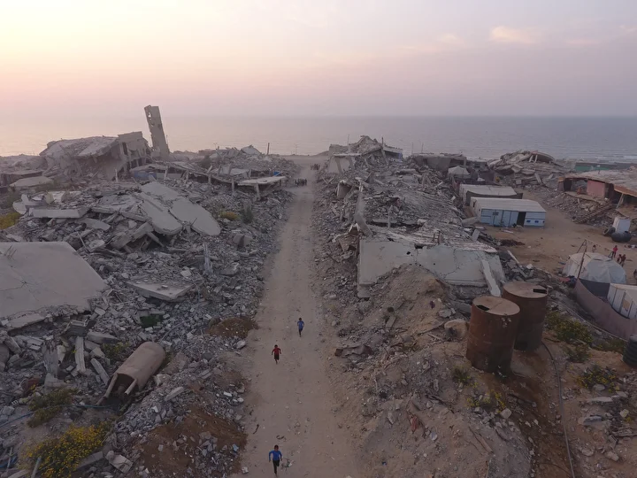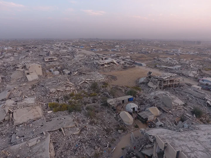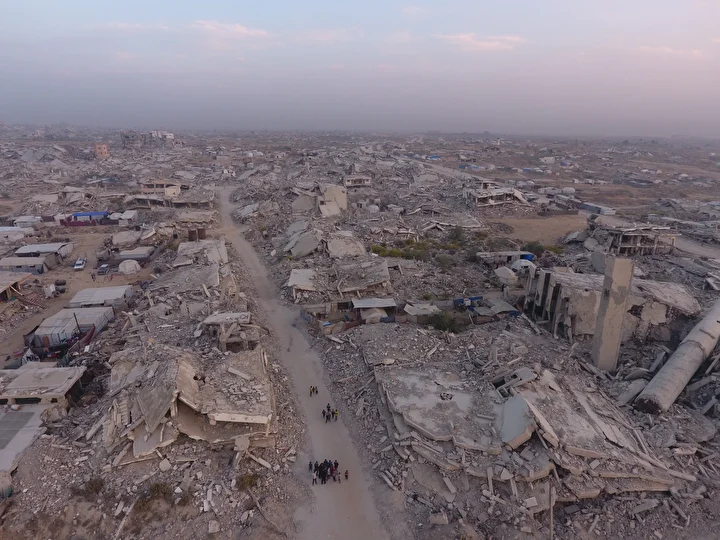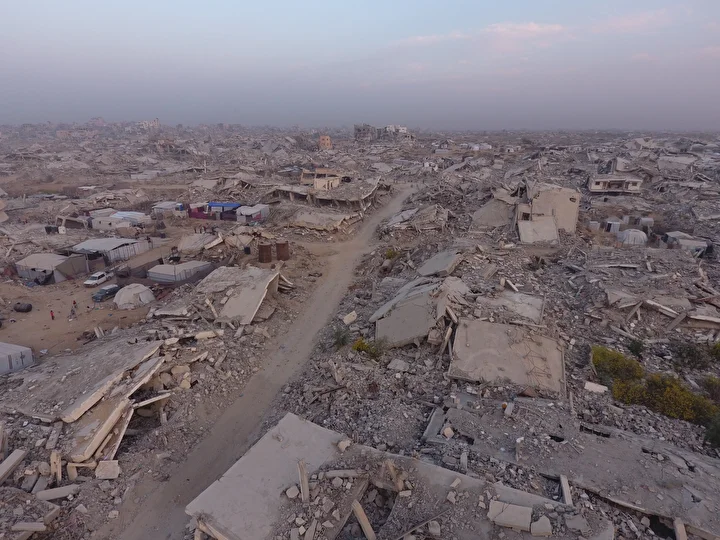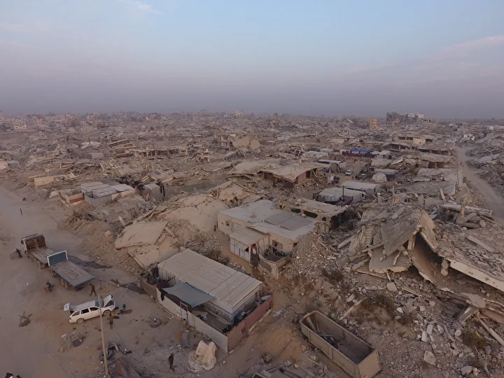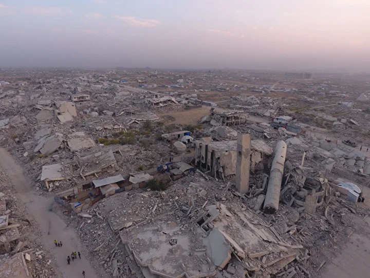 İsrail saldırılarının büyük yıkıma neden olduğu Gazze kentinin batısındaki Şeyh Aclin Mahallesi, ateşkesin ardından havadan görüntülendi. Saldırılar sonucu, çok sayıda bina tamamen yıkılırken mahalledeki altyapı büyük oranda tahrip oldu ve bölge enkaza dönüştü.