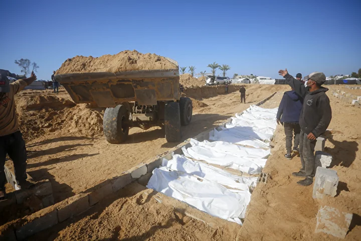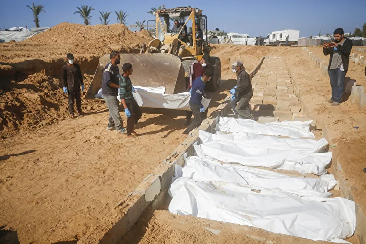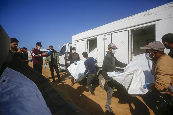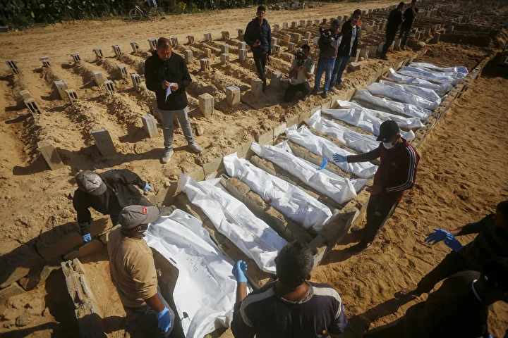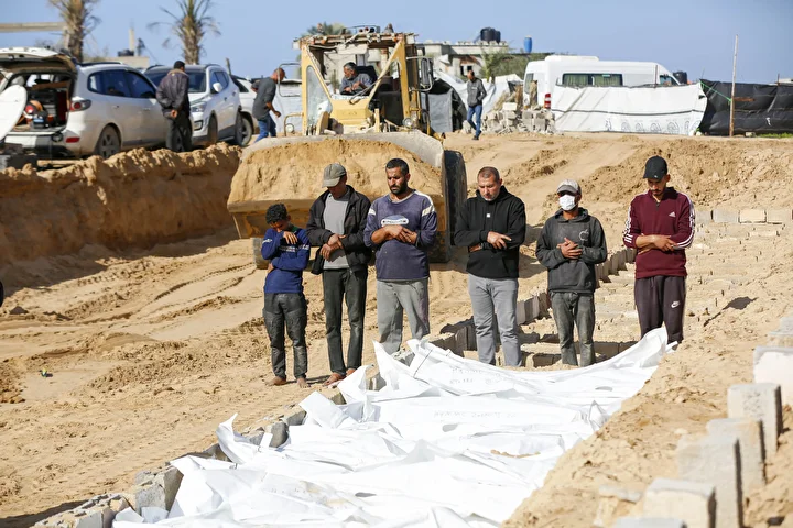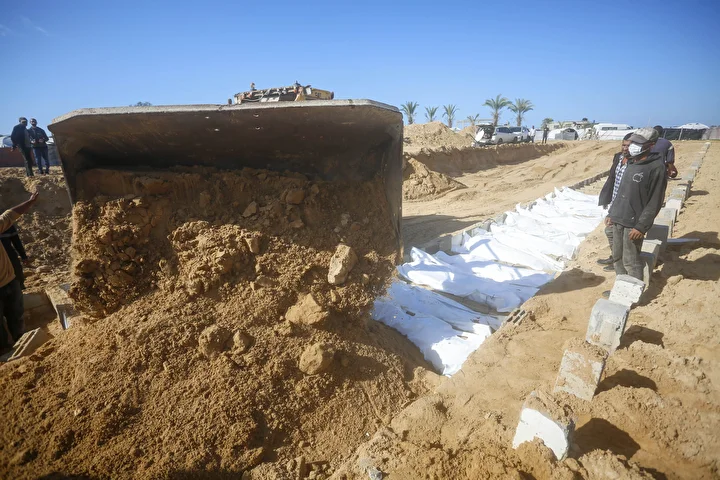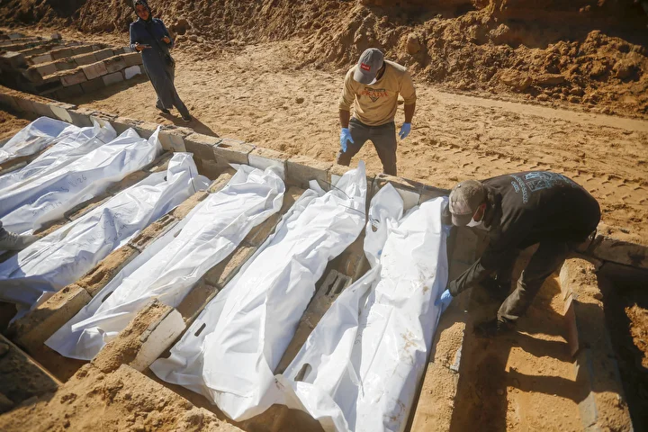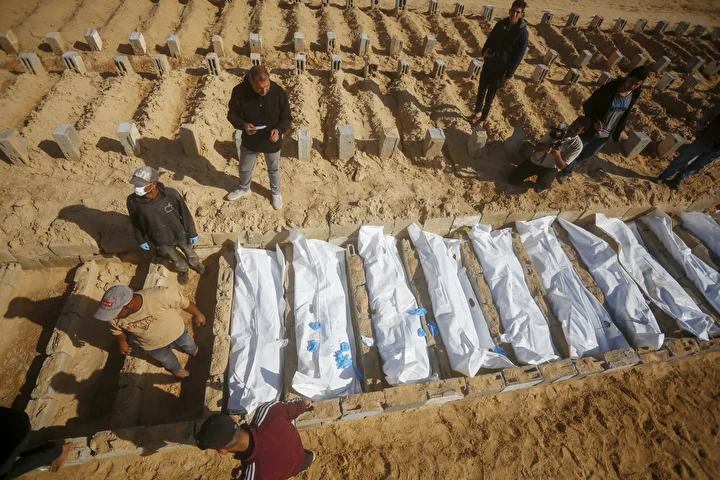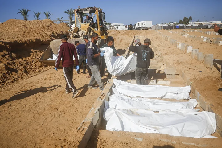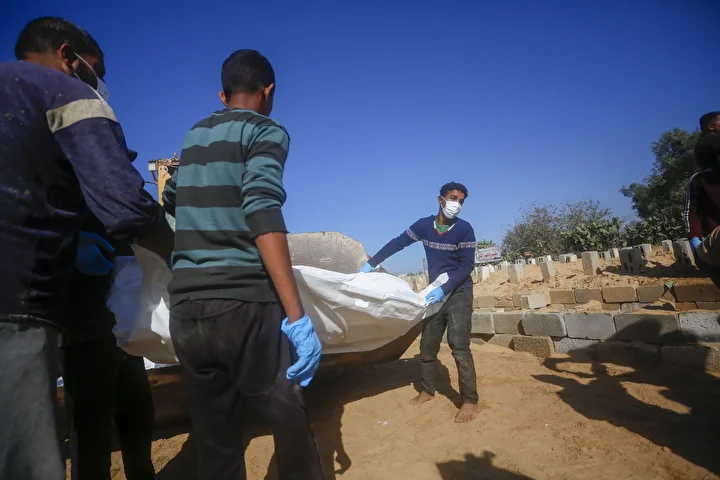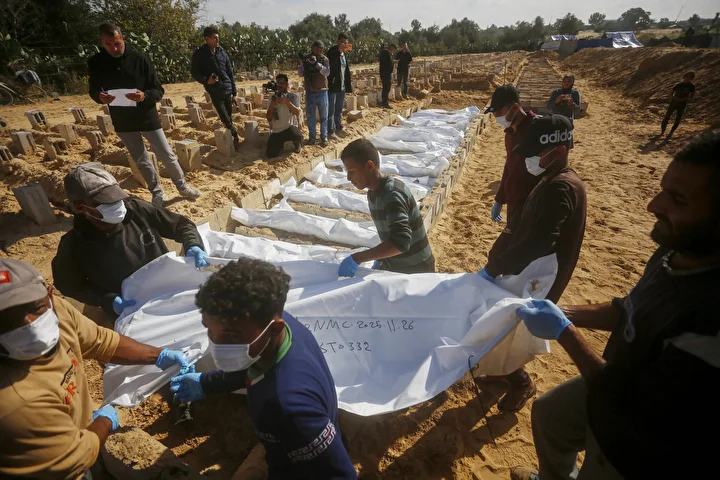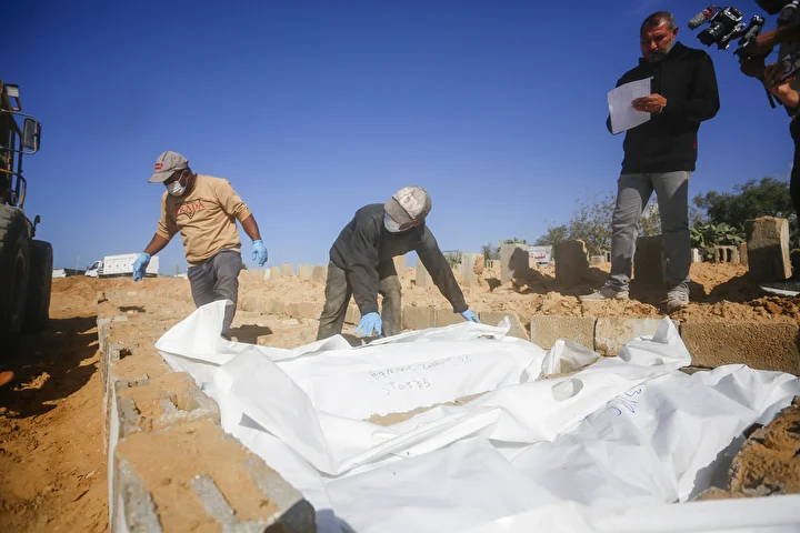 İsrail’in Gazze’ye yönelik saldırıları sırasında alıkonulan ve kimlikleri belirlenemeyen 14 Filistinlinin naaşı, teslim edilmelerinin ardından Deyr el-Belah’ta toplu mezara defnedildi.