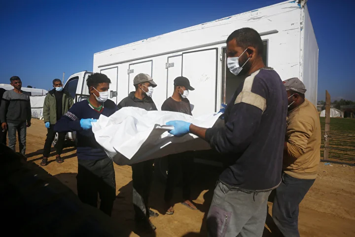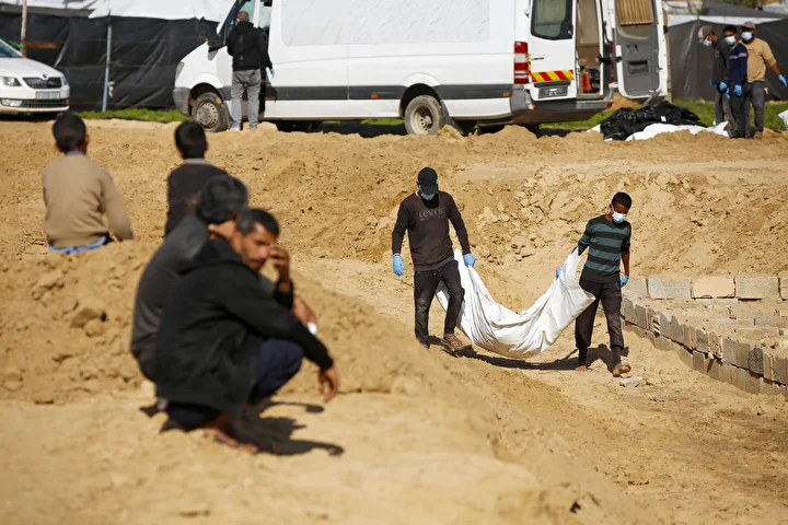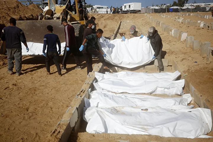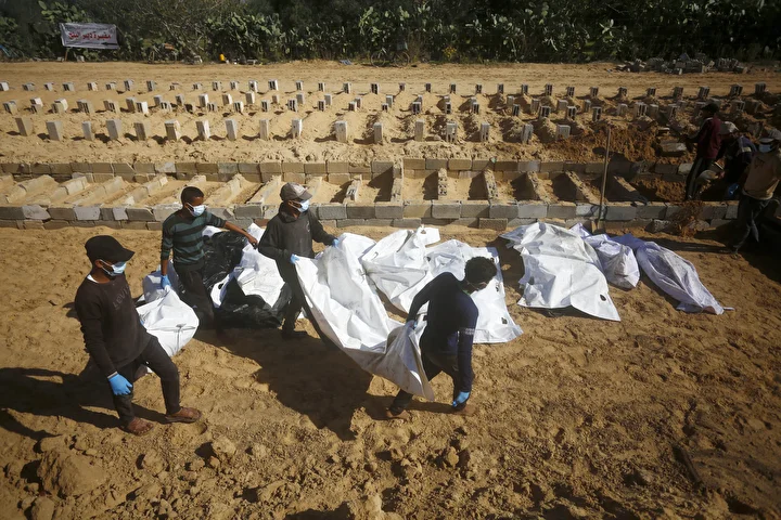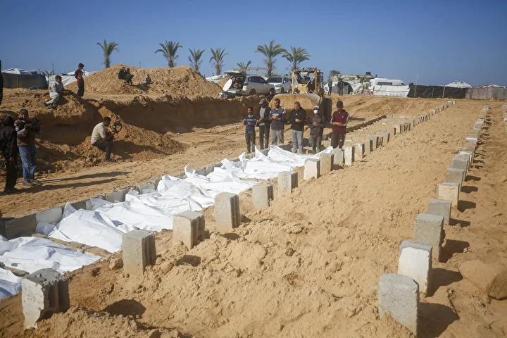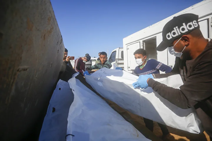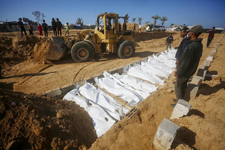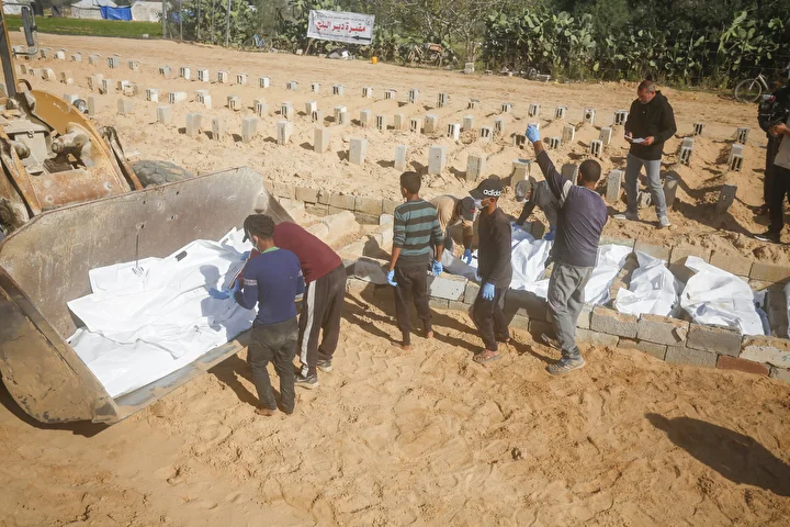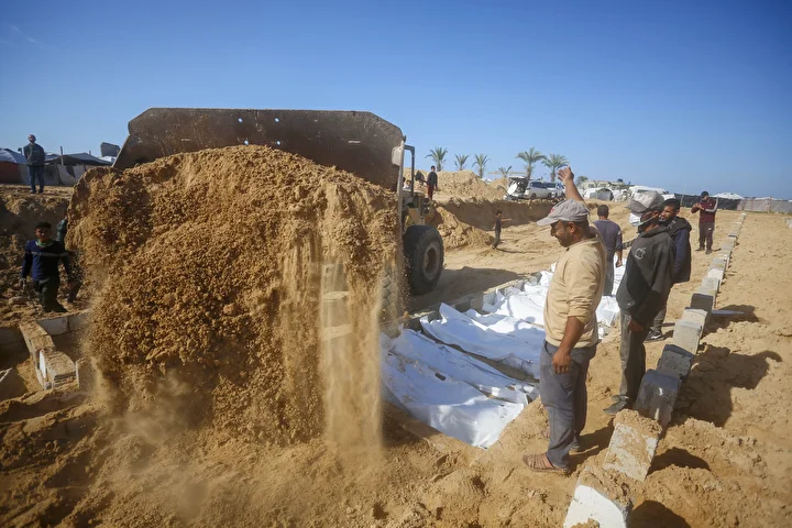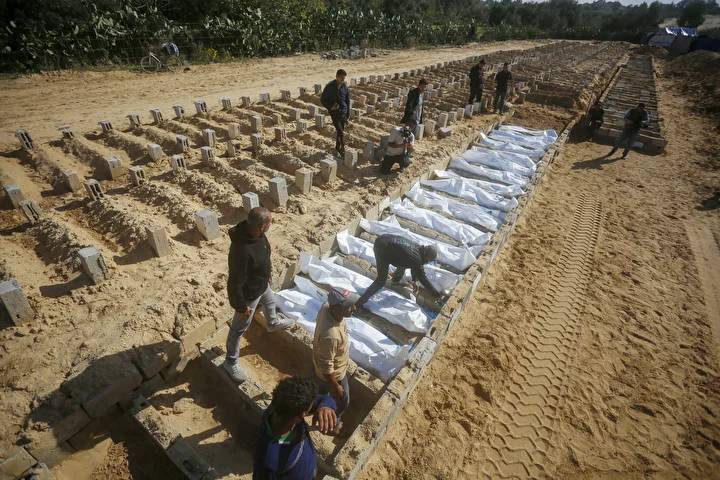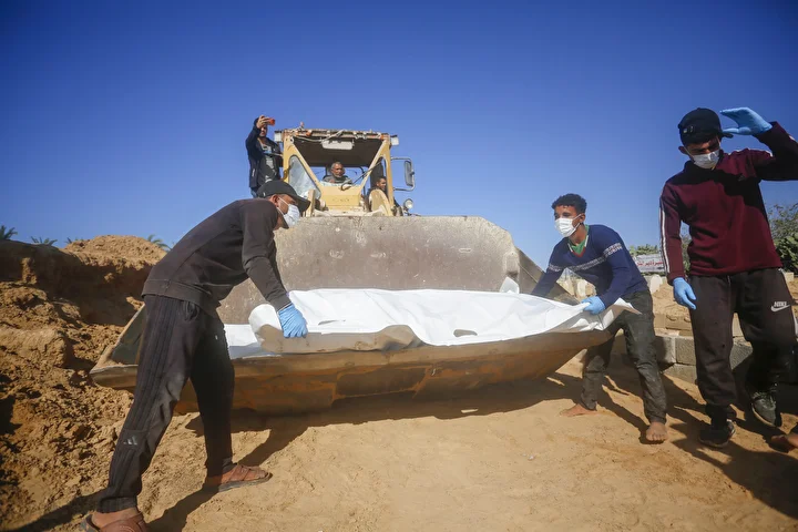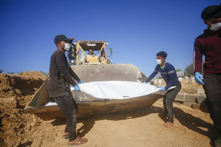 İsrail’in Gazze’ye yönelik saldırıları sırasında alıkonulan ve kimlikleri belirlenemeyen 14 Filistinlinin naaşı, teslim edilmelerinin ardından Deyr el-Belah’ta toplu mezara defnedildi.