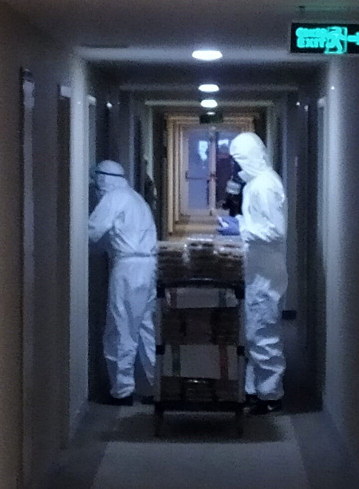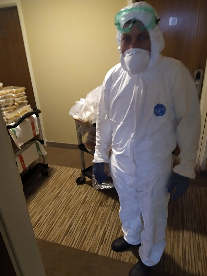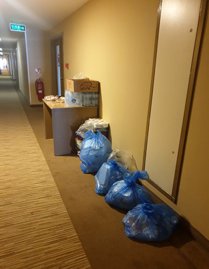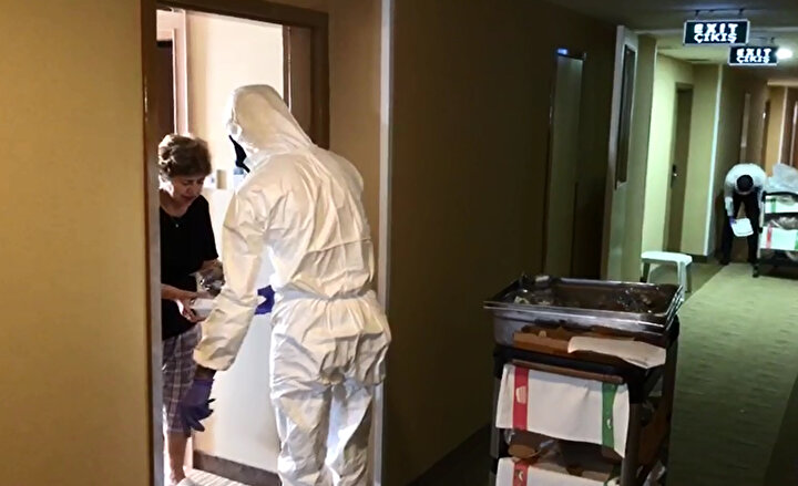 Otel içinde her katta tedarik istasyonu oluşturulduğundan da bahseden Karaman, su ve tuvalet kağıdı gibi ihtiyaç olabilecek ürünlerin de buralara bırakıldığını söyledi.