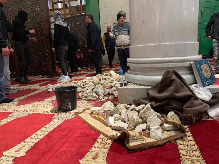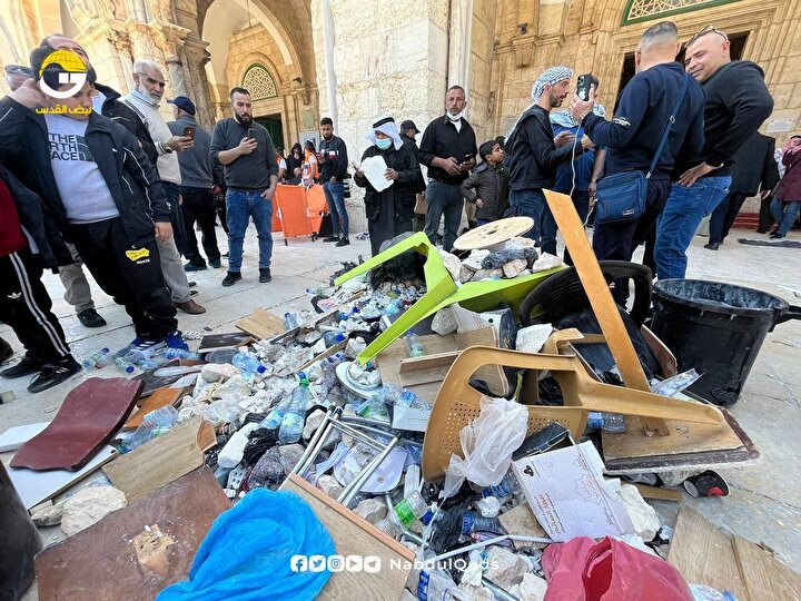 Cuma sabahı İşgalci İsrail Polislerinin yaptığı baskıda taş, cam kırıkları ve gaz fişekleriyle doldu.