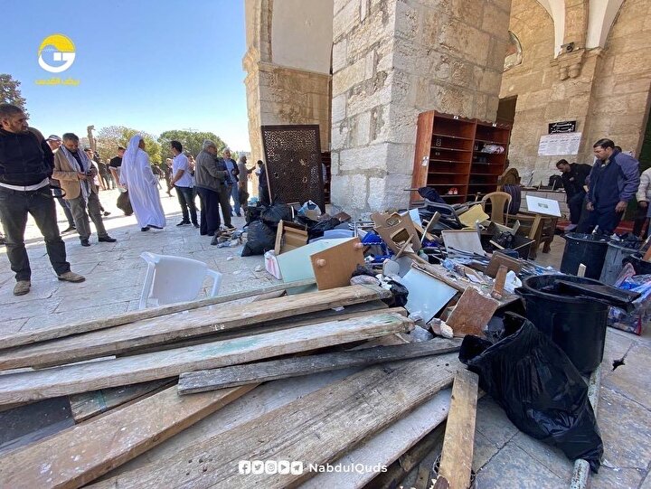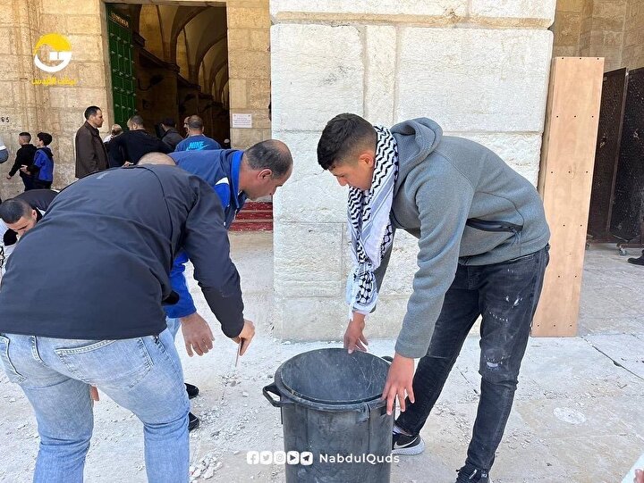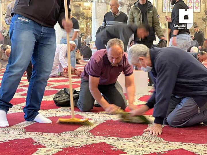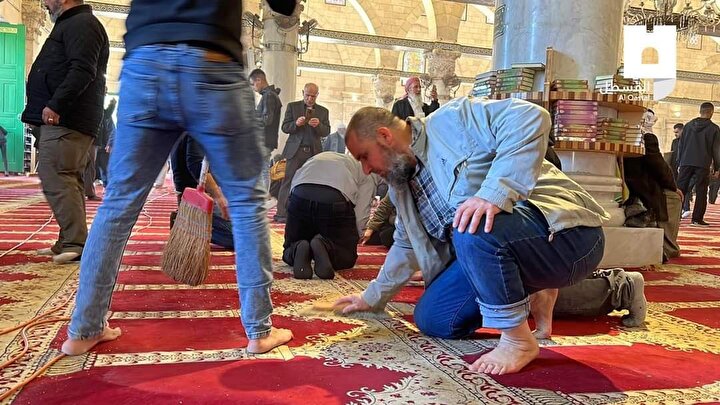 Cuma günü sabah namazı sonrası işgalci İsrail polislerinin Mesci-i Aksa'ya yaptığı baskından kalan cam kırıkları ve gaz fişekleri Aksa'yı kullanılmaz hale getirmişti. Cuma namazı öncesi Kudüslü Müslümanlar temizlik yaparak Aksa'yı binlerce Müslümanın katılacağı cuma namazına hazırlıyor.