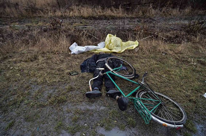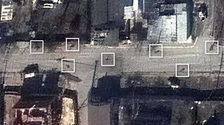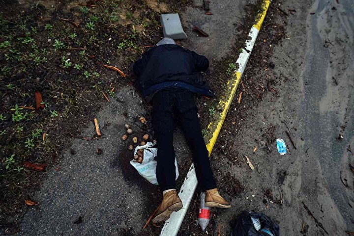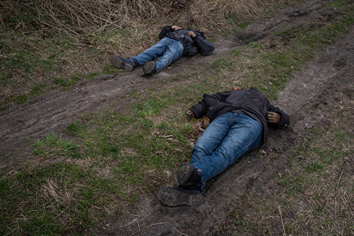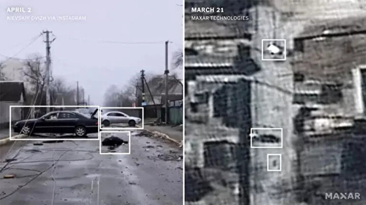 Rus işgalcilerin çekildiği 1 Nisan tarihinde cesetler aynı şekilde sokakta duruyordu. Uydu fotoğraflarını New York Times'a analiz eden uzmanlar, cesetlerin neredeyse üç hafta boyunca aynı pozisyonda durduğunu kaydediyor.