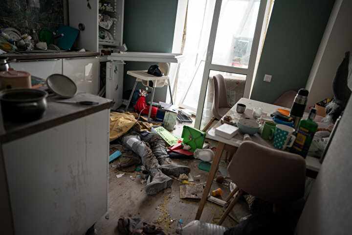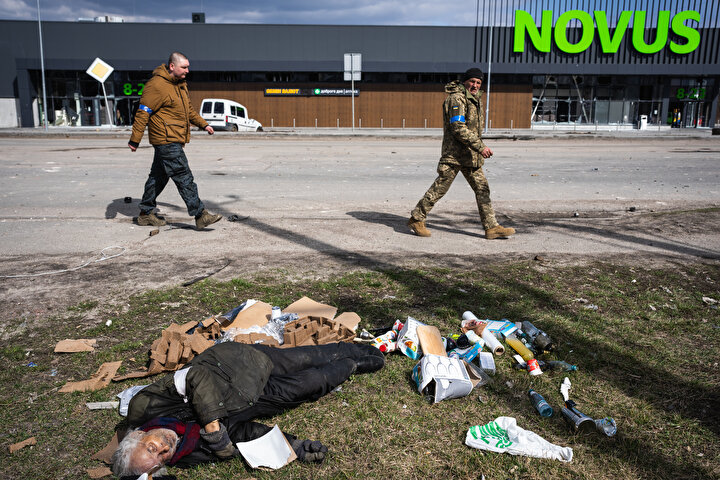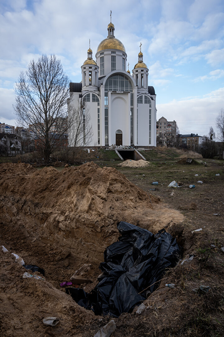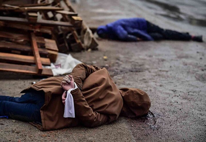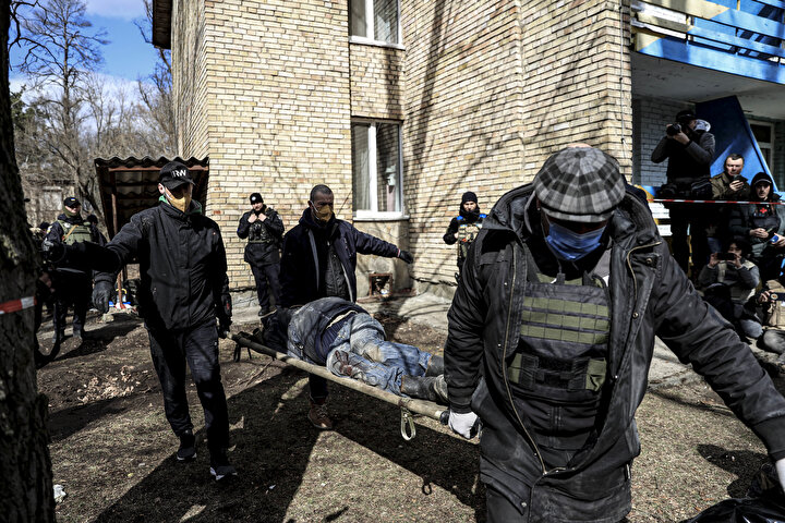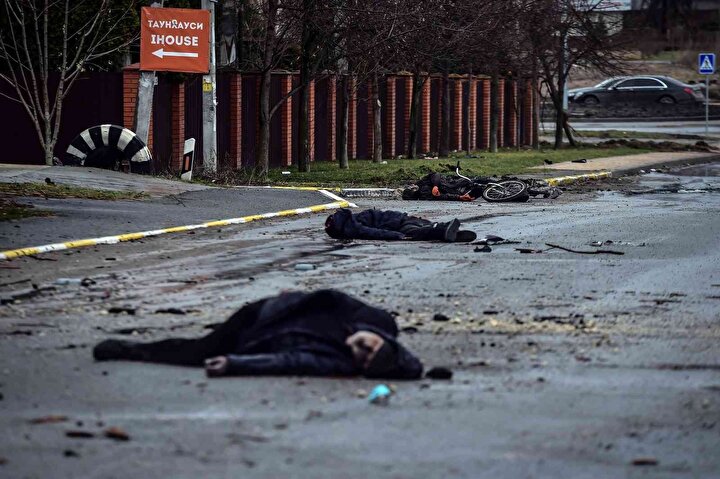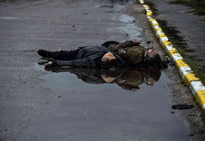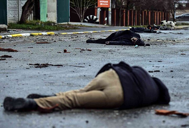 Ukrayna'nın Bucha ve Irpin kentlerinde Rusya'nın sivillere yönelik saldırılarında 410 sivilin cansız bedenine ulaşılırken bu gelişme dış basında geniş yer buldu. Rusya ise görüntülerin ABD'nin 'siparişi' üzerine çekildiğini söz konusu karelerin fotomontaj ve sahte olduğu öne sürdü. Amerika New York Times gazetesi, Bucha'daki Yablonska Sokağı'nın farklı tarihlerde çekilmiş uydu fotoğraflarını sayfasına taşıdı. Fotoğraflarda çok sayıda cesedin yerde yattığı ve 1 Nisan'da Rus işgalciler çekilinceye kadar yerlerinden kıpırdatılmadığı görüldü.