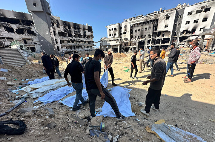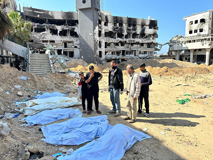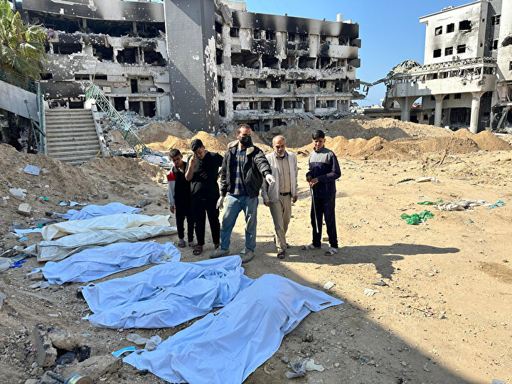 İsrail ordusunun baskın düzenleyerek 2 hafta boyunca yüzlerce Filistinliyi öldürdüğü ve harabeye çevirdiği Gazze kentindeki Şifa Hastanesi avlusunda toplu mezar bulundu.