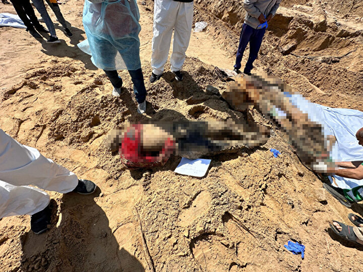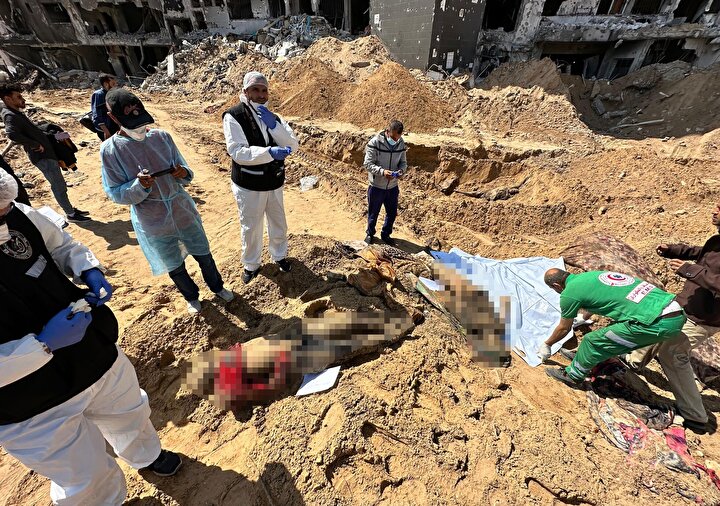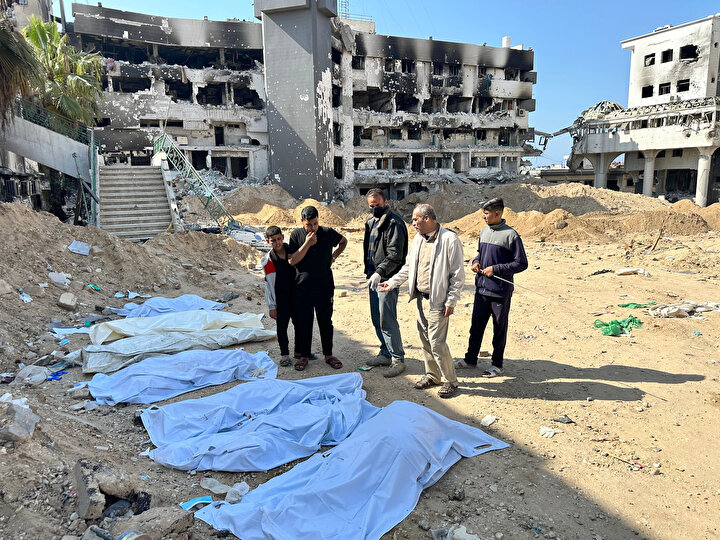 Sağlık kaynakları da hastane bahçesinde bulunan 10 cenazenin, İsrail askerleri tarafından daha önce öldürülüp, hastanenin ön bahçesine düzensiz bir şekilde gömüldüğünü belirtti. Hastanenin avlusunun çeşitli yerlerinde onlarca çürümüş, yanmış, kesilmiş, toplu veya tek başına gömülmüş cesede rastlandığını bildiren sağlık kaynakları, hastanenin avlusunda ve çevresinde arama çalışmalarını sürdürdüğünü, gömülü cenazelerin sayısının kesin olarak belirlenmesinin henüz mümkün olmadığını anlattı.