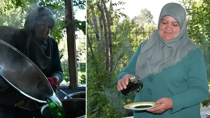 "Bu yıl bahçemin 50 metrekarelik bölümünde yetiştirdiğim naneleri topladıktan sonra pekmez yaptım. İlçedeki kadınlar da bana destek oldu. 1 kilogram naneden yarım kilogram pekmez çıkıyor. 1 kilogram naneyi, 1 kilogram şeker ve 1 litre suyla kaynattıktan sonra yarım kilo pekmez elde ediyorum. Pekmez kendiliğinden yeşil rengi alıyor. 320 mililitrelik şişelere dolduruyorum."