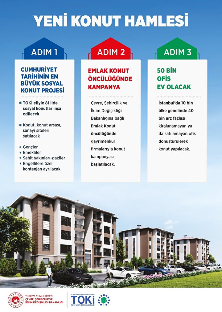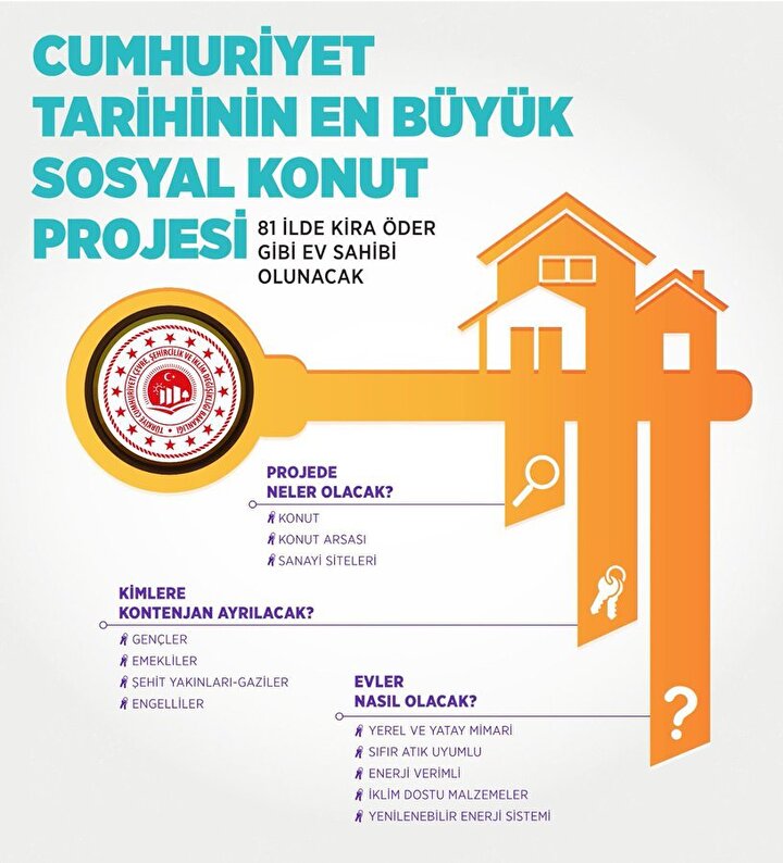 Buna göre Cumhuriyet Tarihinin En Büyük Sosyal Konut Projesi ile vatandaşlar 81 ilde kira öder gibi ev sahibi olacak.