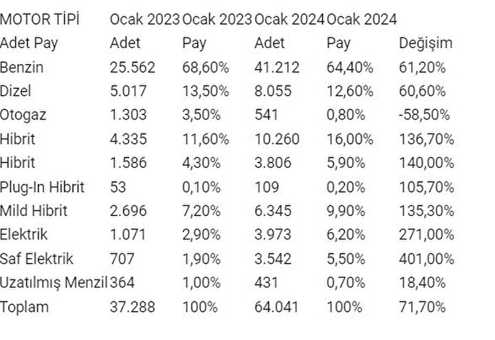 Türkiye otomobil pazarında motor tipine göre adetler, paylar ve değişimler ile tam elektrikli marka ve model satış sıralaması şu şekilde: