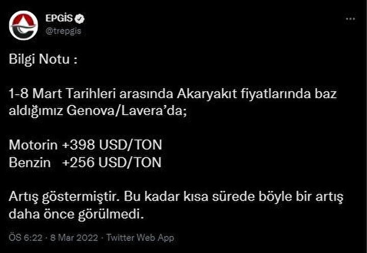 Mart ayının başından bugüne kadar akaryakıt fiyatlarının baz alındığı GenovaLavera'yı örnek gösteren EPGİS, motorinin ton fiyatına 398 dolar, benzine ise 256 dolar zam geldiğini açıkladı.