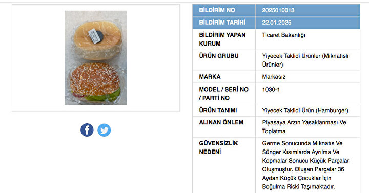 Ticaret Bakanlığı, piyasa gözetimi ve denetimi faaliyeti gerçekleştiren yetkili kuruluşlar tarafından güvensizliği tespit edilen ürünleri Güvensiz Ürün Bilgi Sistemi'nde ilan etmeye devam ediyor. Ticaret Bakanlığı, Güvensiz Ürün Bilgi Sistemi (GÜBİS) üzerinden yaptığı duyuruda, çocuk güvenliğini tehdit eden bir ürün için toplatma kararı aldığını açıkladı.