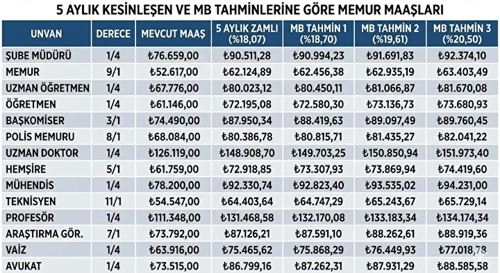 Yıl sonu senaryosu: Merkez Bankası’nın tahminleri baz alındığında ise memur maaşlarına yapılacak artış; yıllık enflasyonun %31 olması halinde %18,7, %32 olması halinde %19,61, %33 olması halinde ise %20,50 seviyelerine yükselecek.