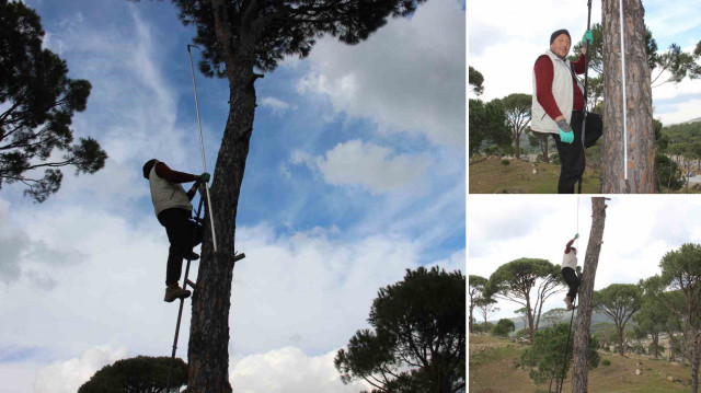 Türkiye'nin önemli ihracat ürünlerinden olan çam fıstığında (Künar) hasat sezonu sürerken, oldukça zor şartlar altında yapılan hasatta üreticiler ekmek parası için metrelerce yükseklikteki çam ağaçlarına demirden yapılan merdivenler yardımıyla çıkarak gözünü kırpmadan çalışıyor.