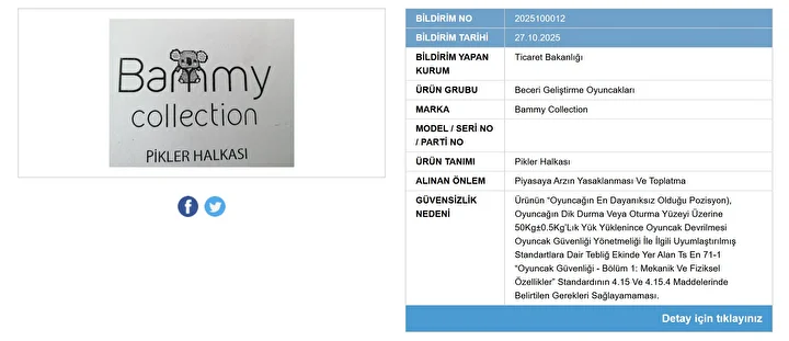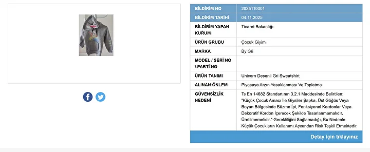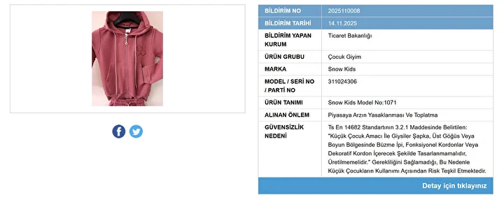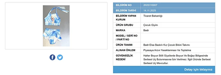 Yapılan denetimlerin ardından Bakanlık, Snow Kids ve Badr markalı iki adet çocuk giyim ürününün kullanımının güvensiz olduğunu tespit etti.