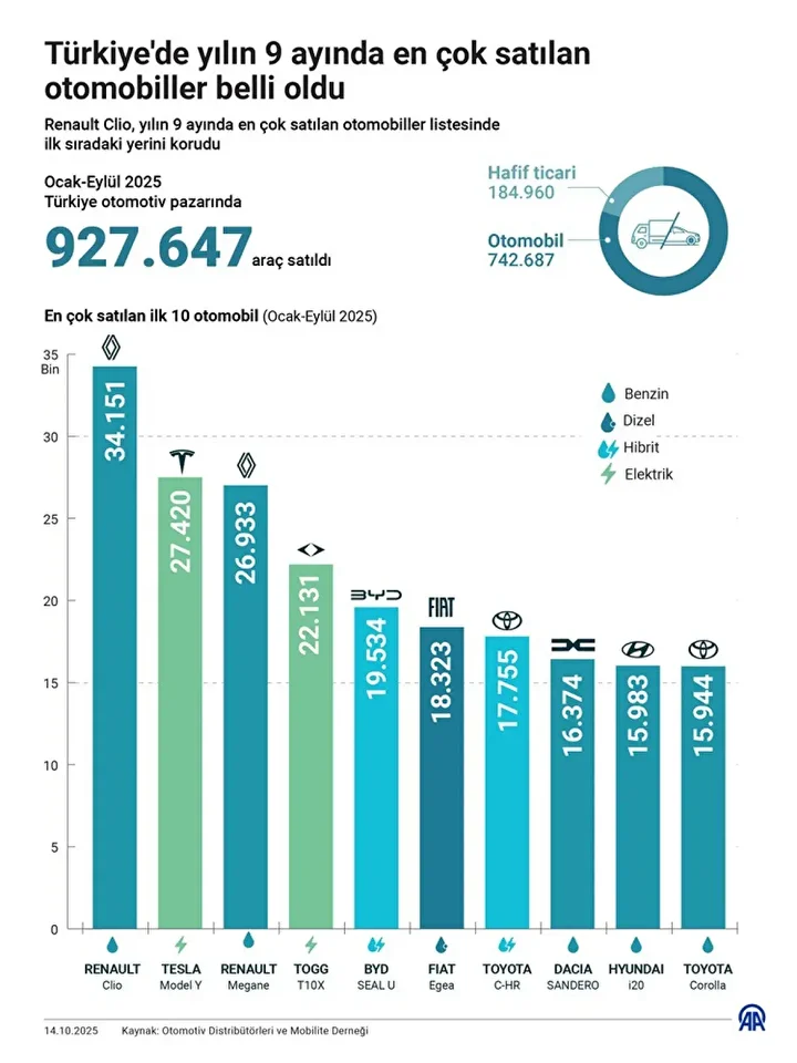 Otomotiv Distribütörleri ve Mobilite Derneği (ODMD) verilerine göre 2025’in ilk dokuz ayında Türkiye’de en çok satan otomobiller belli oldu. İşte Türkiye’de 2025 yılında en çok tercih edilen, satış rekorları kıran popüler otomobil modelleri listesi…