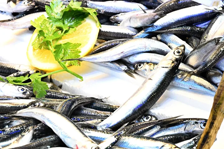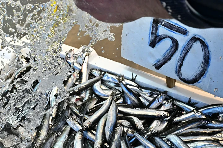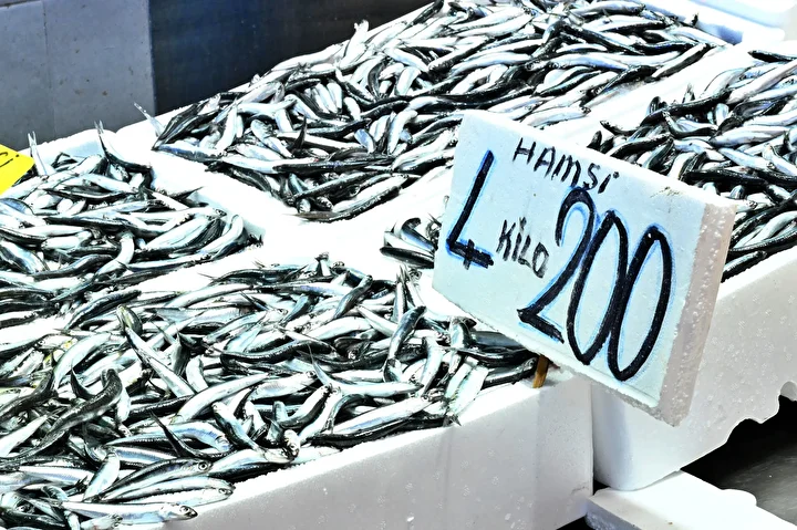 Trabzon'da balıkçı tezgahlarını süsleyen hamsinin kilogramı 50 liradan satışa sunuluyor.
