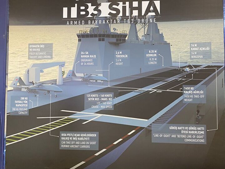 Bunun için ortaya koyduğu İHA ve SİHA'lar ile dünyanın yakından takip ettiği Bayraktar firması kolları sıvamış kısa süre içerisinde dev savaş gemisine otomatik kalkış ve iniş yapabilecek SİHA olan Bayraktar TB3 ortaya çıkarmıştı.