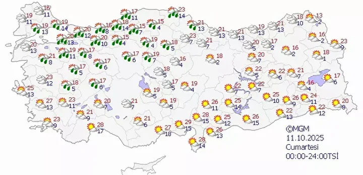Meteoroloji Genel Müdürlüğü tarafından yapılan tahminlere göre: Ülkemizin kuzey, iç ve batı kesimlerinin parçalı, yer yer çok bulutlu, Marmara (Çanakkale hariç), İç Anadolu’nun kuzeybatısı, Batı ve Orta Karadeniz, Doğu Karadeniz kıyuıları ile Kütahya, Uşak, Afyonkarahisar, Konya, Aksaray, Kırşehir, Yozgat ve Artvin çevrelerinin yağmur ve sağanak yağışlı, yer yer gök gürültülü sağanak yağışlı, diğer yerlerin az bulutlu ve açık geçeceği tahmin ediliyor.