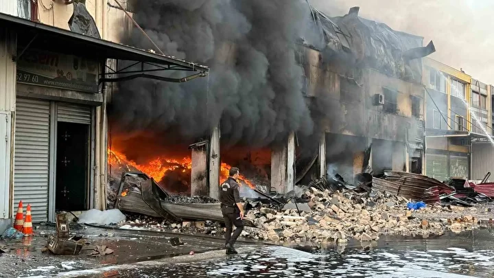 Bitişik iş yerlerine de sıçrayan yangında soğutma çalışmaları sürüyor.