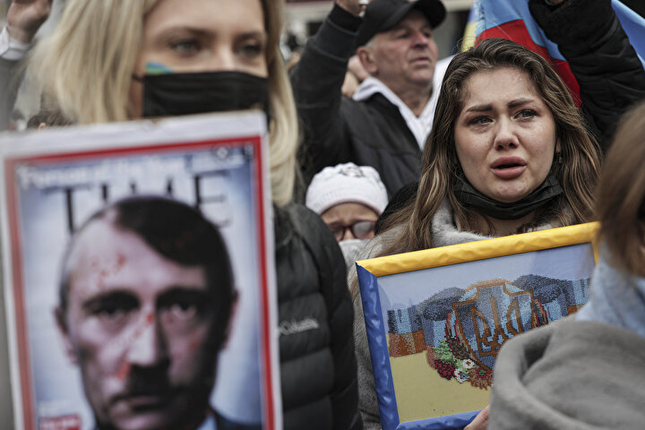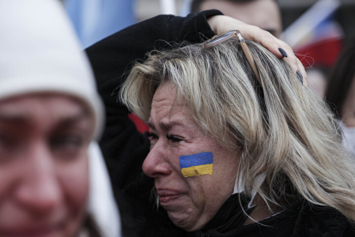 Kalabalık, Rusya'nın Ukrayna'ya harekatını protesto ederken, bazı kişilerin gözyaşı döktüğü görüldü. Basın açıklaması öncesi Ukrayna’da hayatını kaybedenler için saygı duruşunda bulunuldu.