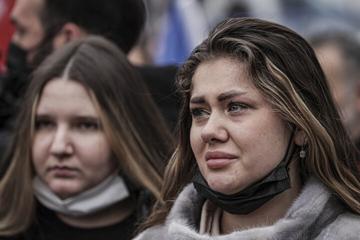 Kalabalık, Rusya'nın Ukrayna'ya harekatını protesto ederken, bazı kişilerin gözyaşı döktüğü görüldü.