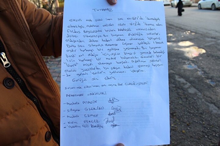 Apartman sakinleri bir araya gelerek çözüm bulunması için savcılığa başvurdu. Kadının evin sahibi olması nedeniyle şu ana kadar bir sonuç alamayan apartman sakinleri, çocuklarının korktuğunu ve çok zor durumda kaldıklarını aktardı. Kadının aynı evde yaklaşık 15 yıldır kaldığı ancak son 3 aydır rahatsızlığının artması nedeniyle sürekli farklı sesler çıkartmaya başladığı belirtildi.