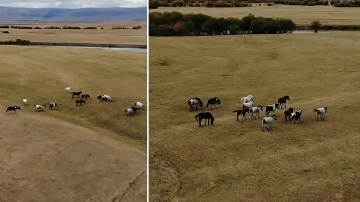 Dron ile çekilen bu eşsiz görüntüler, aynı zamanda Ardahan’ın doğa turizmi potansiyeline de dikkat çekiyor. Bir süre meralarda karınlarını doyuran yılkı atları daha sonra gözlerden kayboldu. Yılkı atlarının Ardahan meralarında yiyecek aramaları dron ile kaydedildi.