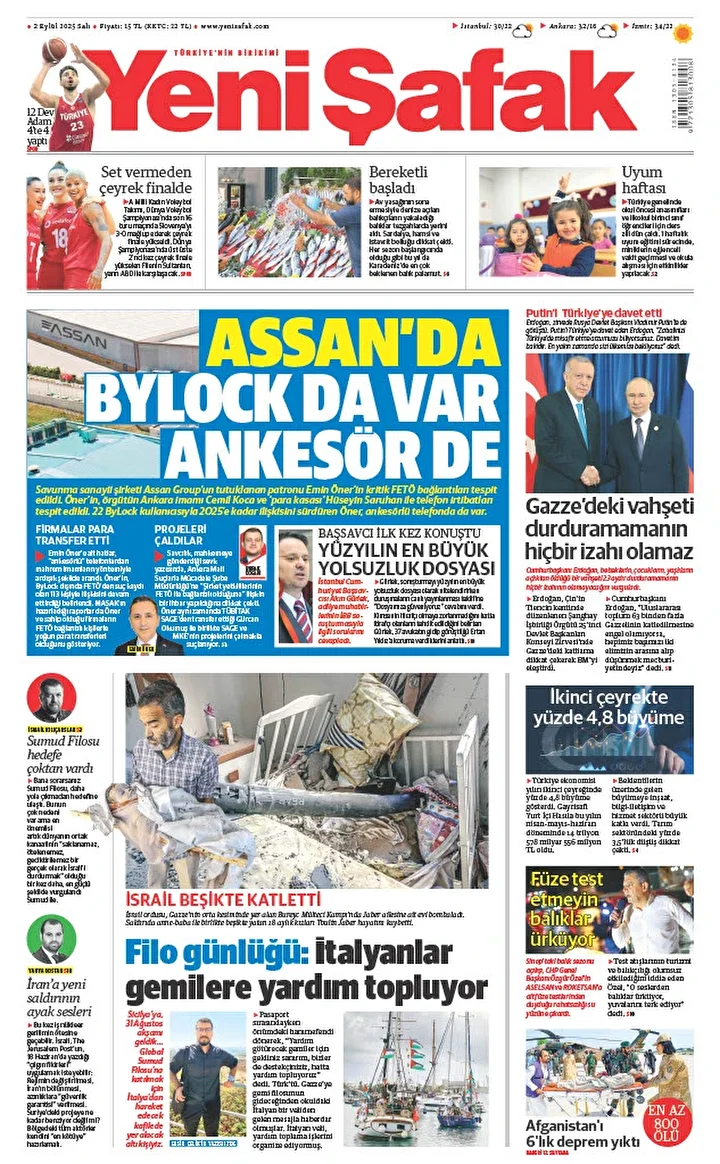 Yeni Şafak Gazetesi'nin 02 Eylül 2025 tarihli birinci sayfasında yer alan manşet ve haberler...
