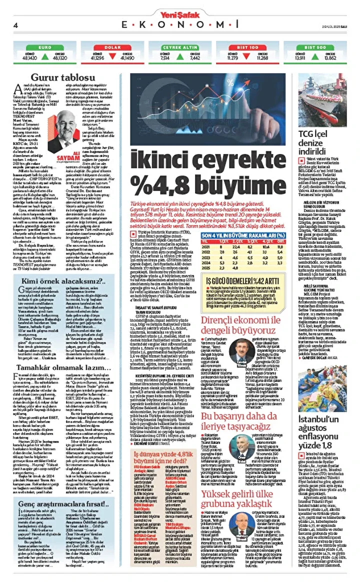 Türkiye ekonomisi yılın ikinci çeyreğinde yüzde 4,8 büyüme gösterdi. Gayrisafi Yurt İçi Hasıla bu yılın nisan-mayıs-haziran döneminde 14 trilyon 578 milyar 556 milyon TL oldu. Beklentilerin üzerinde gelen büyümeye inşaat, bilgi-iletişim ve hizmet sektörü büyük katkı verdi. Tarım sektöründeki yüzde 3,5’lük düşüş dikkat çekti.