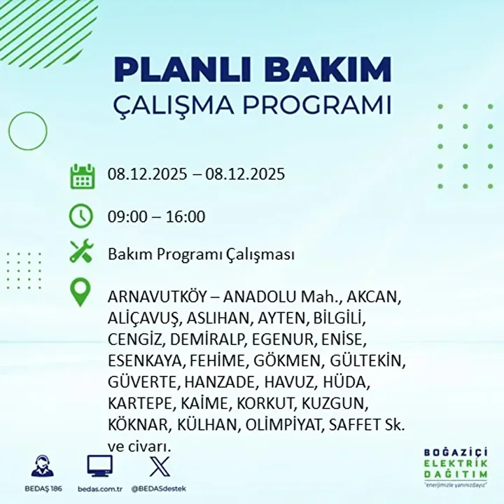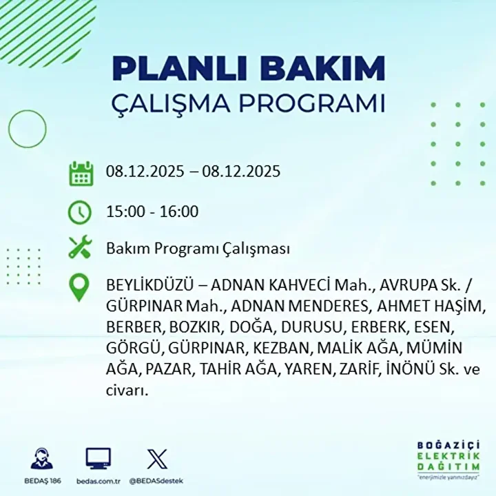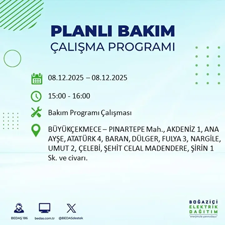 BEDAŞ, şebeke bakım ve altyapı iyileştirme çalışmaları kapsamında 8 Aralık Pazartesi günü Avrupa Yakası'nın büyük bölümünde elektrik kesintisine gidileceğini açıkladı. 23 ilçeyi etkileyecek olan bu kesintiler, bazı noktalarda 10 saati aşakacak şekilde sürecek. İşte BEDAŞ'ın paylaştığı 8 Aralık tarihli kesinti programı.