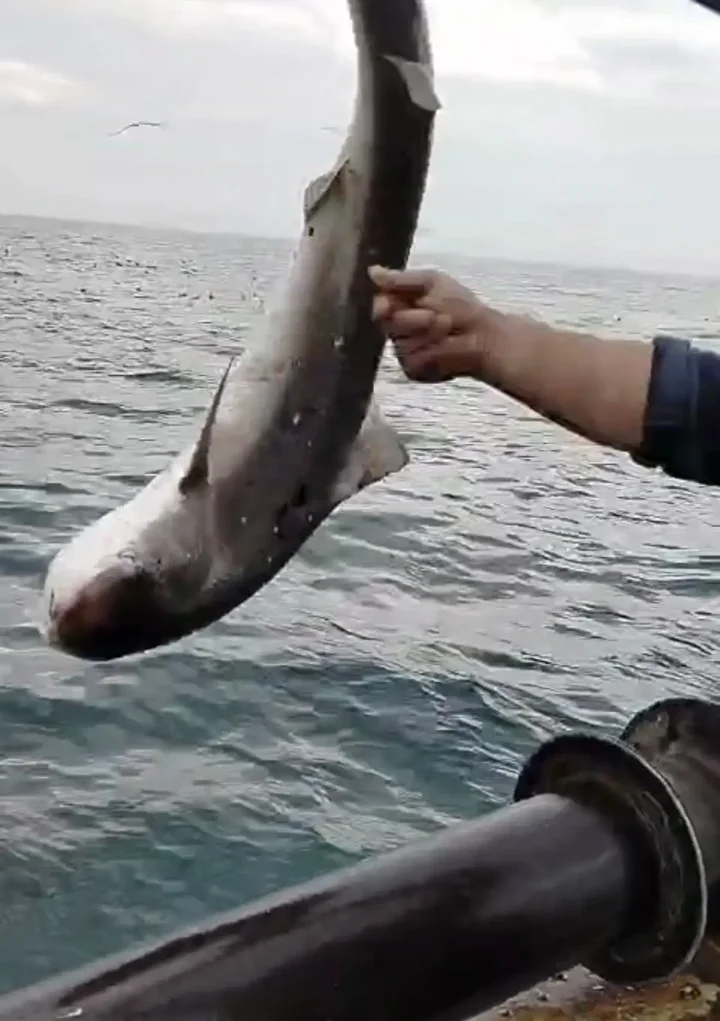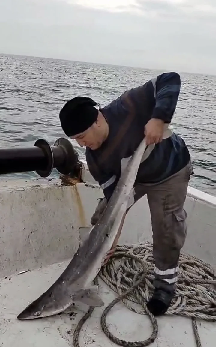 Tarlaağzı Limanı’ndan avlanmak için 'Uzunay 2' isimli balıkçı teknesiyle denize açılan balıkçılar, dün akşam saatlerinde ağı çektiğinde içinde yaklaşık 1,5 metre uzunluğunda camgöz cinsi köpek balığını fark etti.