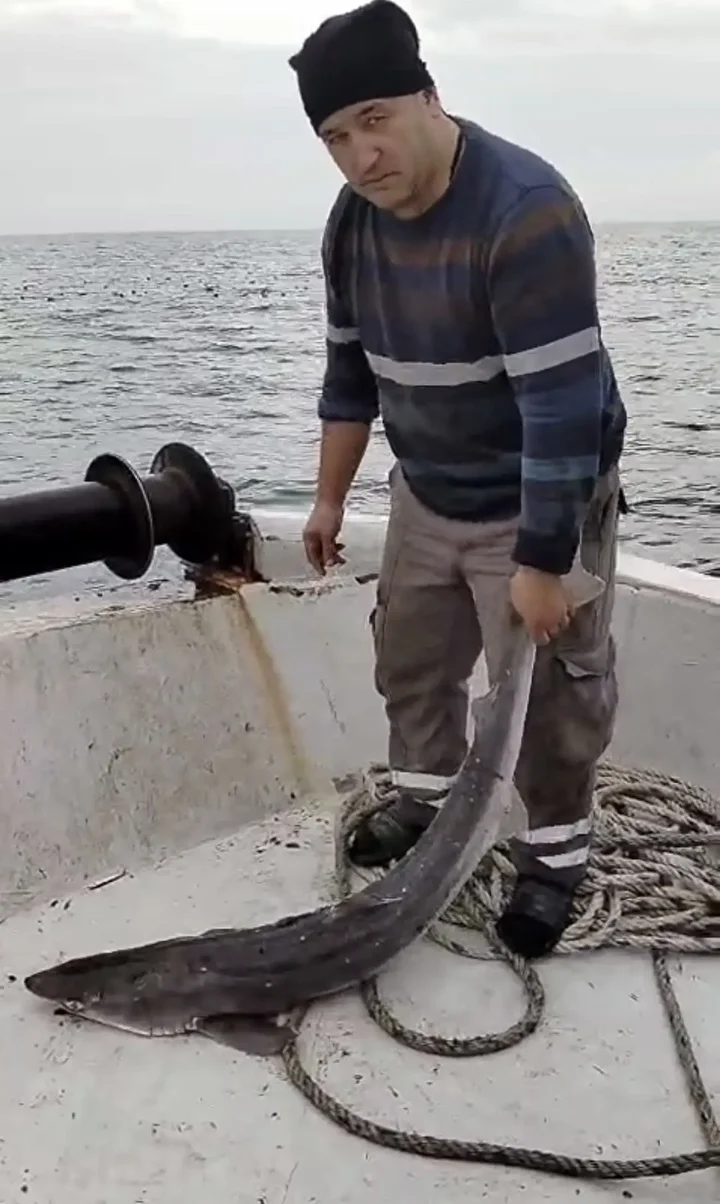 Bartın’ın Amasra ilçesi Tarlaağzı Limanı açıklarında balıkçıların ağına camgöz türü köpek balığı takıldı. Tekne sahibi Tayfun Uça, güçlükle yakaladığı köpek balığını daha sonra tekrar denize bıraktı.