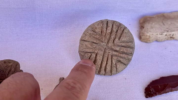 Hayvan figürleri, mühürler, obsidiyen ok uçları ile taş baltaların yer aldığı buluntular arasında çömlek parçası üzerindeki kabartma "insan yüzü" dikkati çekti.