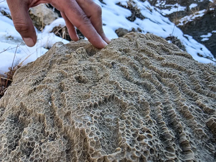 "Çok sayıda mercan resifi (denizlerin sığ yerlerinde, binlerce yıl boyunca, sert mercanların birikmesiyle oluşur) var, taşlaşmış mercanlar var. Çok sayıda da kırılmış, parçalanmış kabukluların yığılması halinde oluşmuş bazı başka fosil oluşumları var. Deniz canlılarının kayaların içerisinde fosilleşmiş olarak bulunması bu dağlık bölgenin bir zamanlar denizlerle kaplı olduğunu bize anlatıyor. Bu alanın milyonlarca yıl öncesine ait olduğu kesin. Fosillerin incelemesini laboratuvarda yapıp, buradaki denizin yaşını ortaya koyacağız."