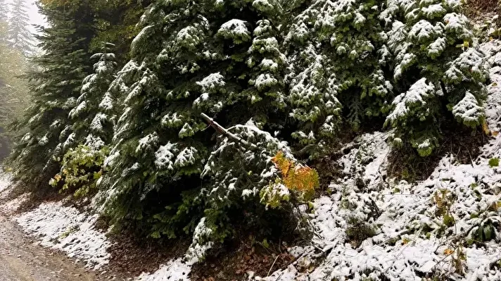 At Yaylası mevkiinde sabah erken saatlerde yağan karla birlikte çam ormanları beyaz örtüyle kaplandı.