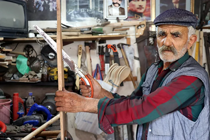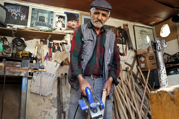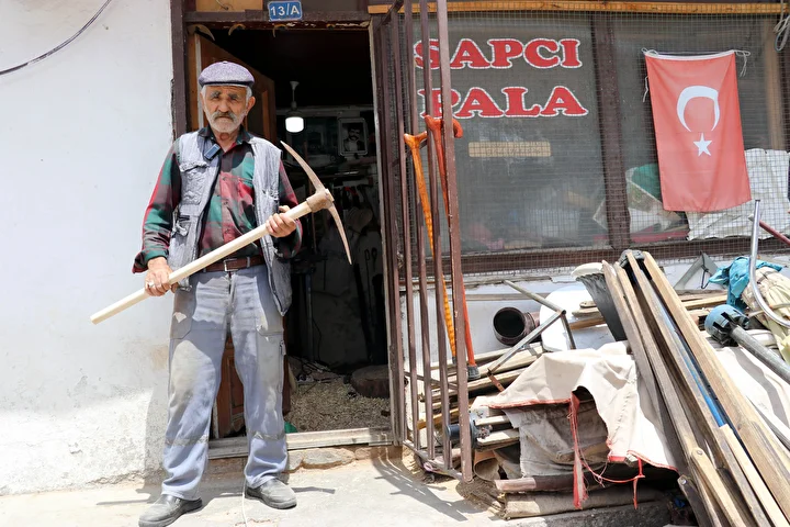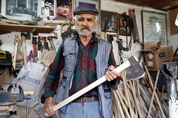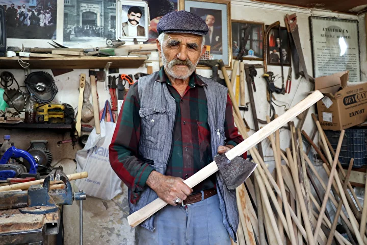 "40 yıl şoförlük yaptım, 600 dönüm arazi ekiyordum. Emekli olduktan sonra bu mesleğe başladım. 'Sapçı Pala' derler bana. Bir yerde çalışmadım, görmedim, yapmadım, bu mesleği kendi kendime öğrendim ama çocukluğumda köyde balta, keser saplarını takardım. Şu an kazma, kürek, balta, çapa sapı ve çadırlara şemsiye yapıyorum. Ölünceye kadar bu işi yapmak istiyorum."