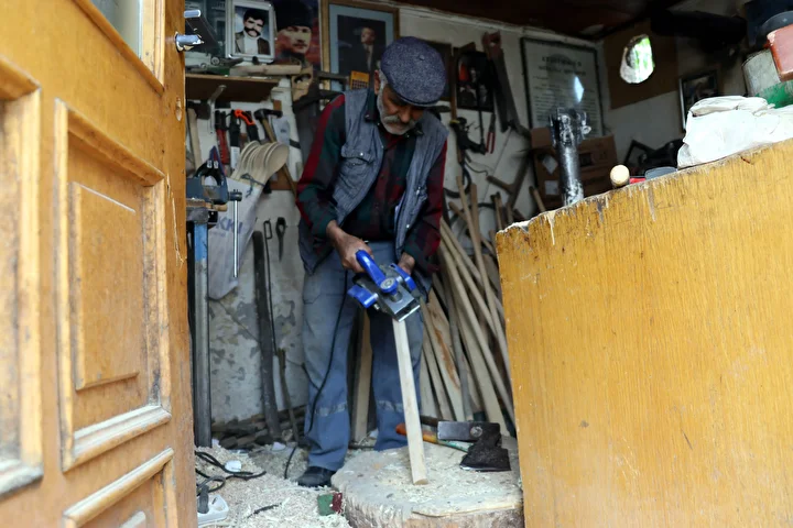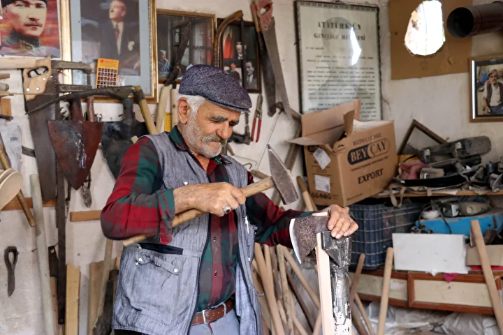 Amasya'nın Merzifon ilçesinde yaşayan 81 yaşındaki İsmet Bilgin, 70 yaşından sonra başladığı kazma, kürek ve balta gibi aletlere sap yapma işini sürdürüyor.