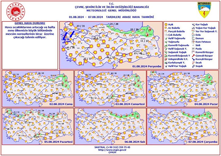 Meteoroloji Genel Müdürlüğü, yeni hava tahmin raporunu yayımlandı. Orta ve Doğu Karadeniz kıyılarına sağanak uyarısı geldi. Marmara ve Kuzey Ege'de poyraz etkili olacak. Diğer bölgelerde önemli bir değişiklik beklenmiyor. Hava sıcaklıklarının artacağı ve hafta sonu ülkemizin büyük bölümünde mevsim normallerinin biraz üzerine çıkacağı tahmin ediliyor. İşte, bölge bölge hava durumu...