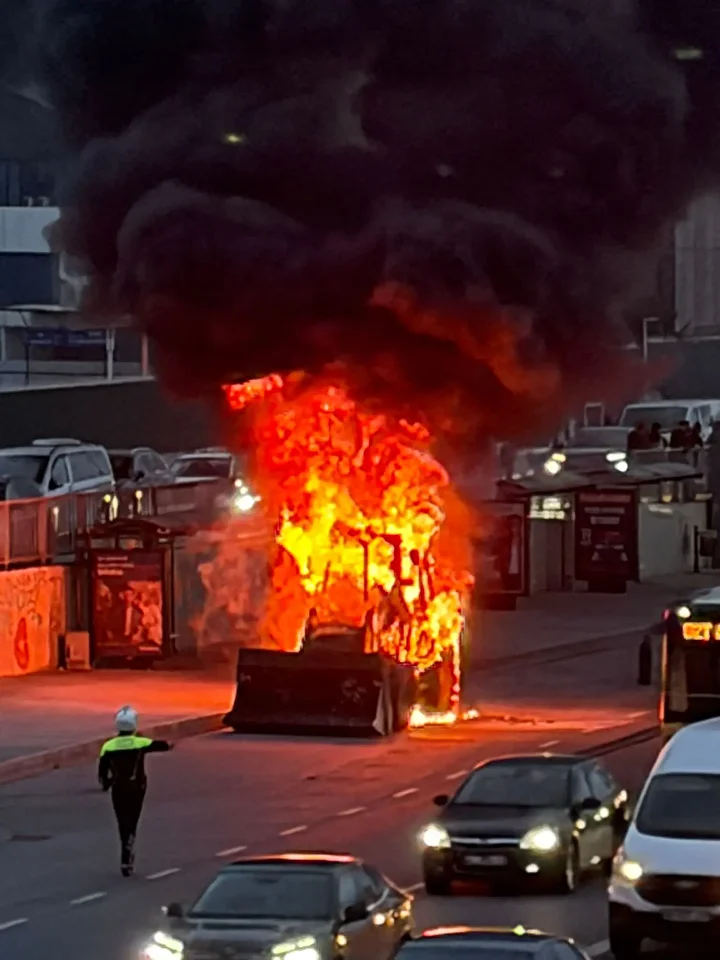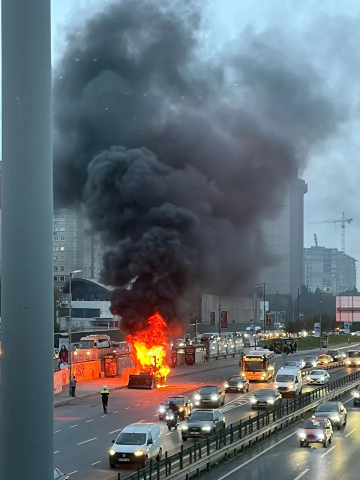Cevizlibağ, D-100 Karayolu yan yolda seyir halindeki iş makinesinde çıkan yangın söndürüldü. İtfaiye ekiplerinin müdahalesi ve oluşan trafik havadan görüntülendi.