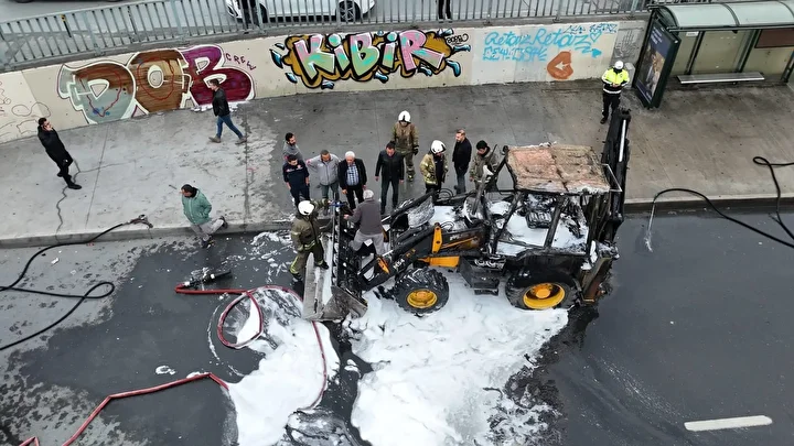 Hızla büyüyen alevler iş makinesinin tamamını sardı. İhbar üzerine olay yerine polis ve itfaiye ekipleri sevk edildi.
