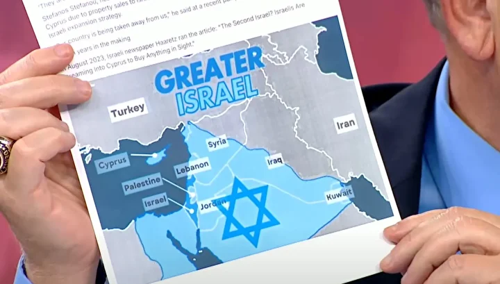 Kıbrıs Adası, “Vadedilmiş Topraklar” içinde geçiyor. 1917 Balfour Deklarasyonu’nun yayınlandığı zaman bu haritalarla kuruldu zaten İsrail. Ve vaat edilmiş topraklar... Şimdi burada yine başka bir haber var: İsrail’de yayınlanan “Daha Büyük İsrail”, “Büyük İsrail” diyor. İsrail’de yayınlanıyor bu. Ve Kıbrıs Adası, İsrail’in bir parçası olarak gösteriliyor.