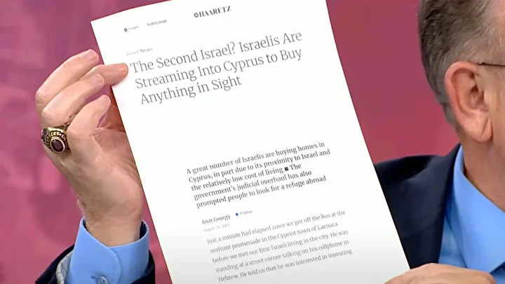 Ve Hayon Haris gazetesi, yine bir Halis gazetesi, en ünlü gazetesi. Gazetesi bir makale, bir manşet atıyor daha doğrusu: “İkinci İsrail Kıbrıs.” diyor. “İbranice’nin, İsrail’den sonra en fazla konuşulduğu yer dünyada Kıbrıs oldu.” diyor.